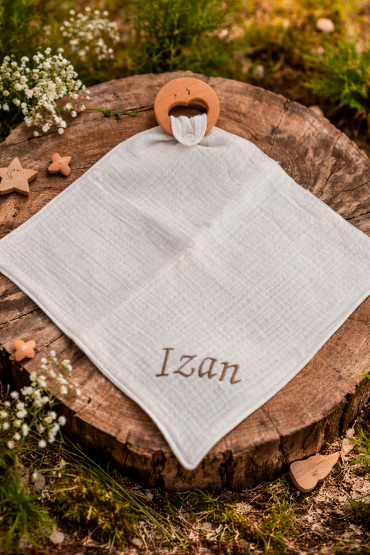 Set mordedor de madera de haya y gasa muselina con mordedor a juego para bebé