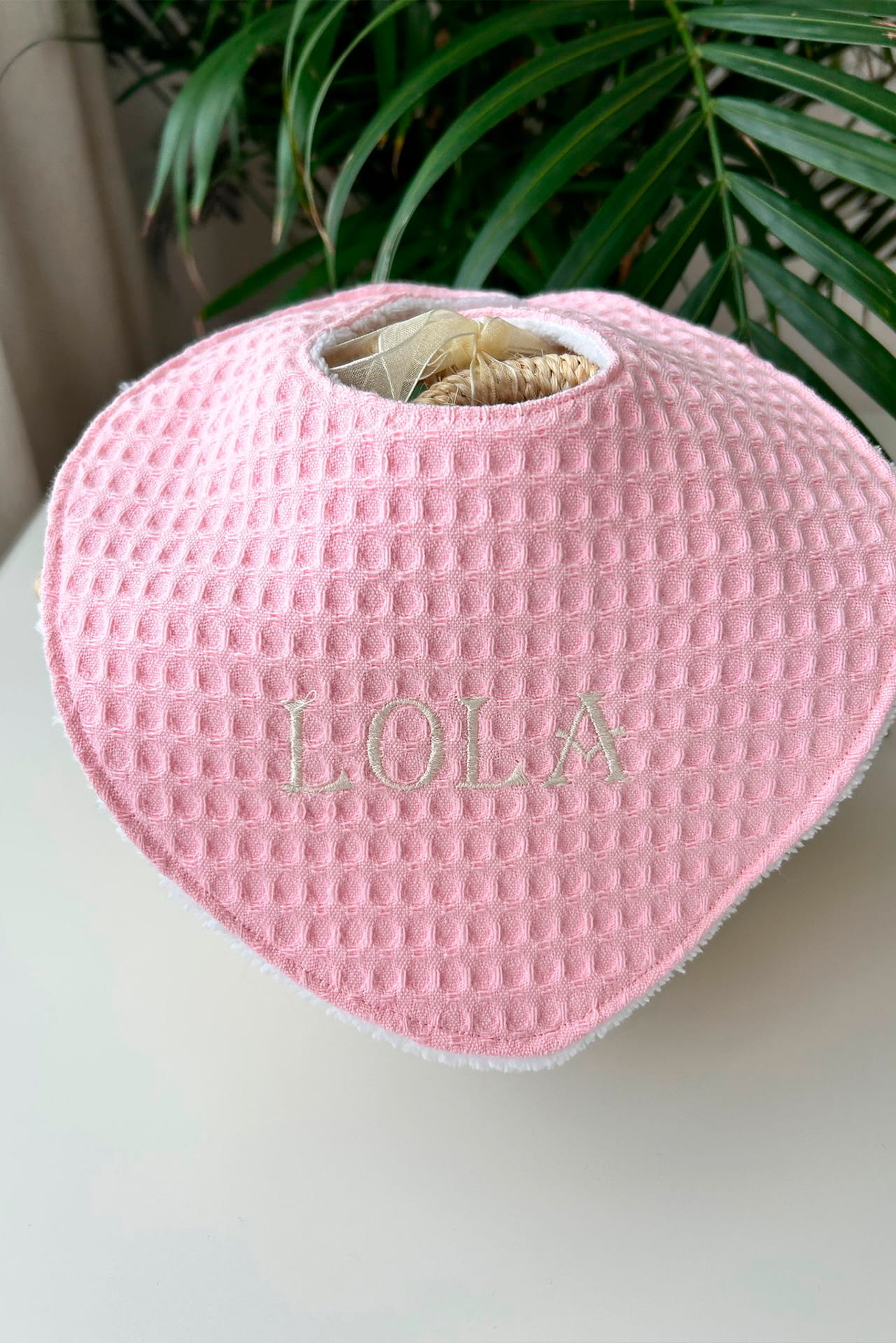 Babero de bebé personalizado en algodón 100%, reverso de rizo impermeable, suave y absorbente, ideal para proteger la ropa durante las comidas. Personalízalo eligiendo el tejido, con nombre bordado, color y tipografía para crear un detalle único y especial, perfecto para el día a día o como regalo.