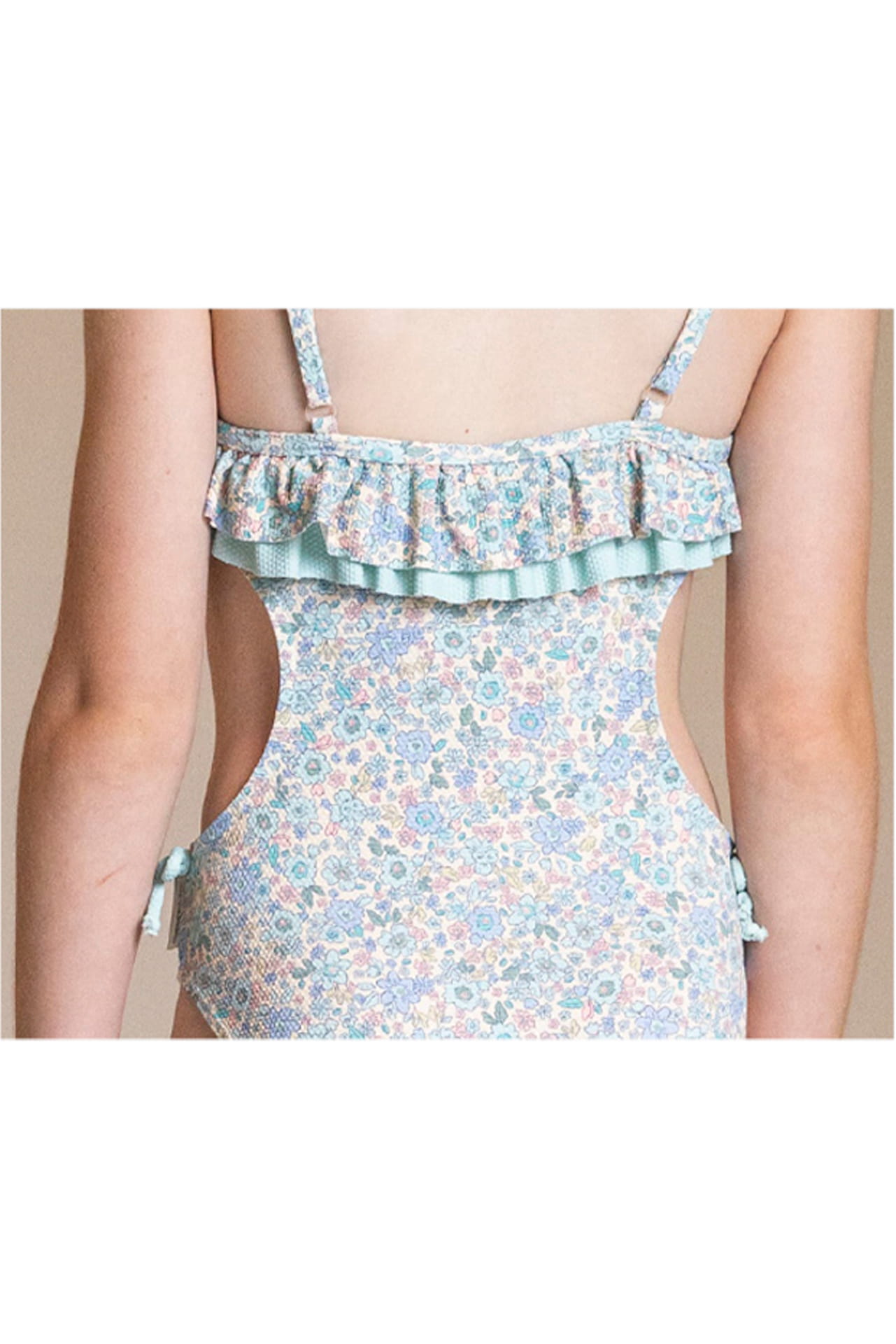 Triquini infantil Waterlemon «Tiny Blossom» con diseño de aberturas laterales y estampado floral Liberty. Incluye doble volante en el escote, tirantes regulables y protección solar UPF 40+.