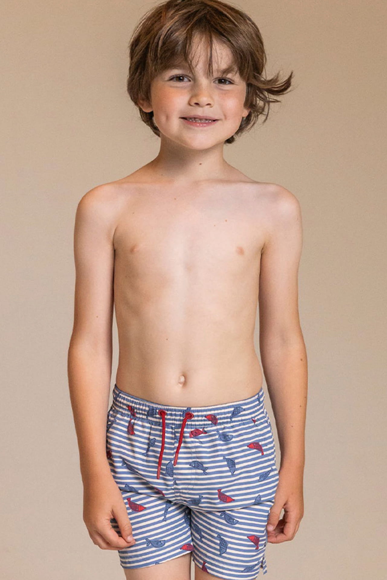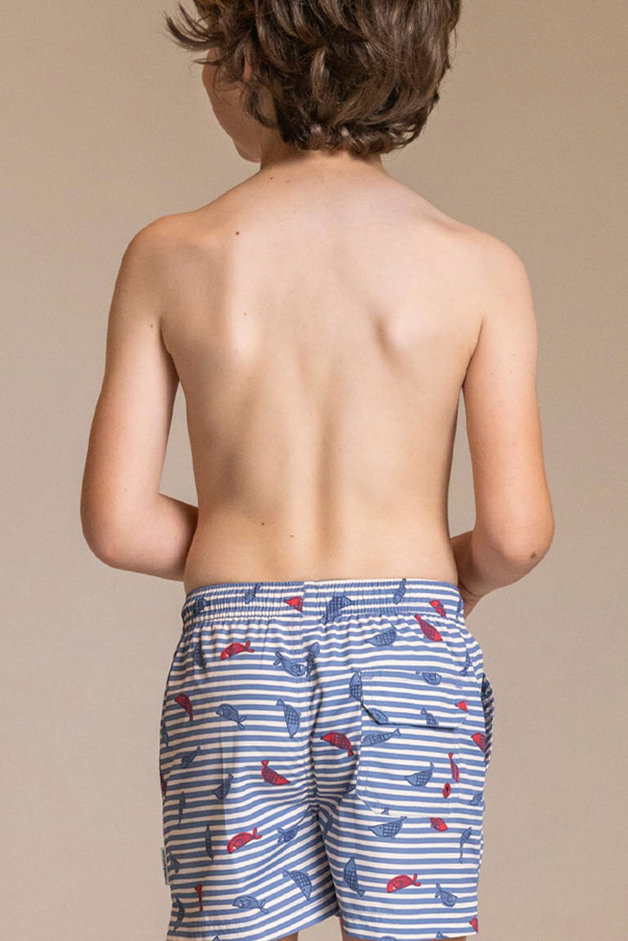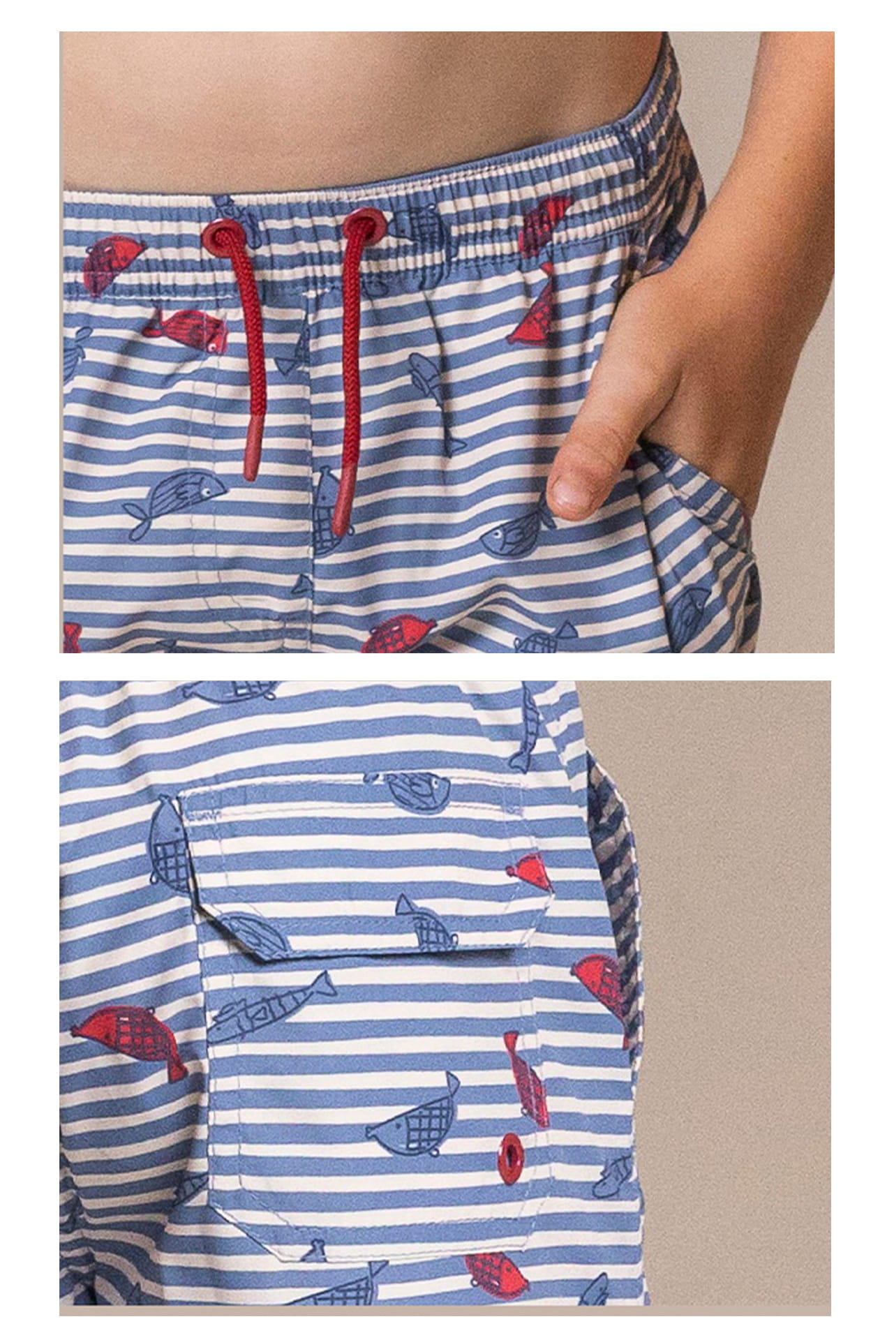 Short de baño infantil de secado rápido con estampado de peces y rayas azules