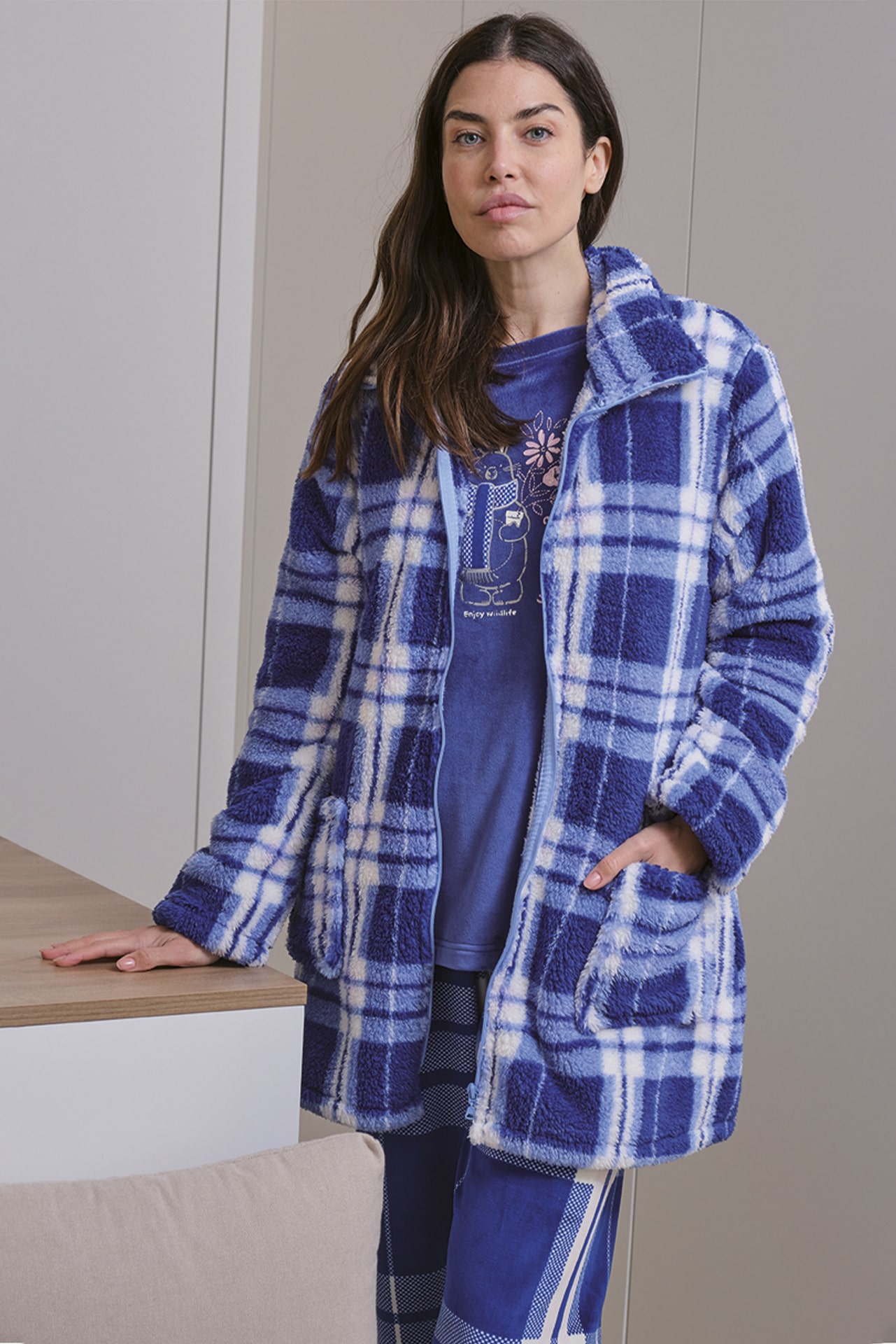 Bata de mujer Muslher 258604CR en coralina 100 % poliéster. Diseño de cuadros azules, cierre con cremallera y bolsillos. Cálida, suave y moderna.