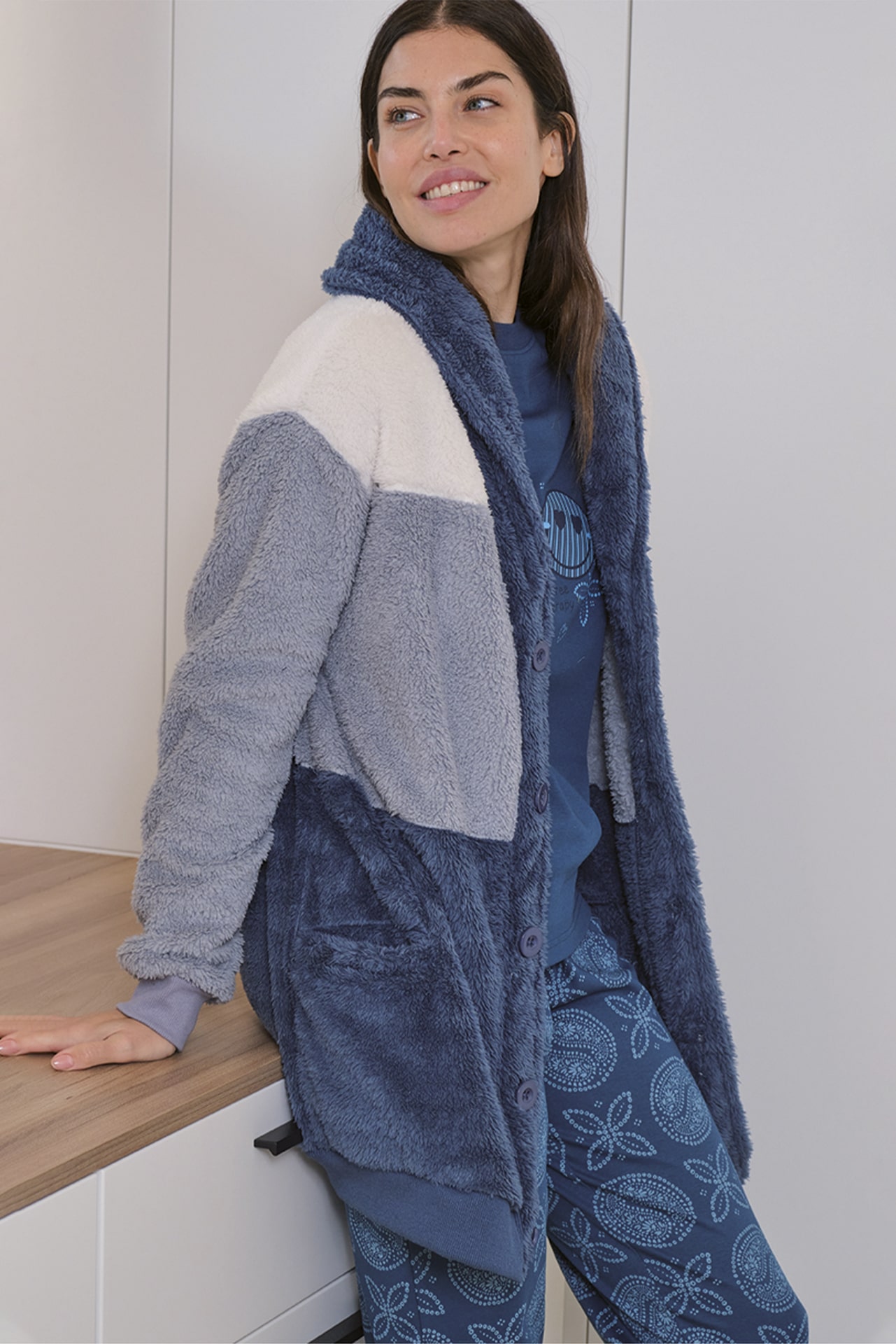 Bata de mujer Muslher 258617 en coralina extrasuave. Tricolor azul y blanco, cierre de botones y bolsillos. Cálida y elegante.