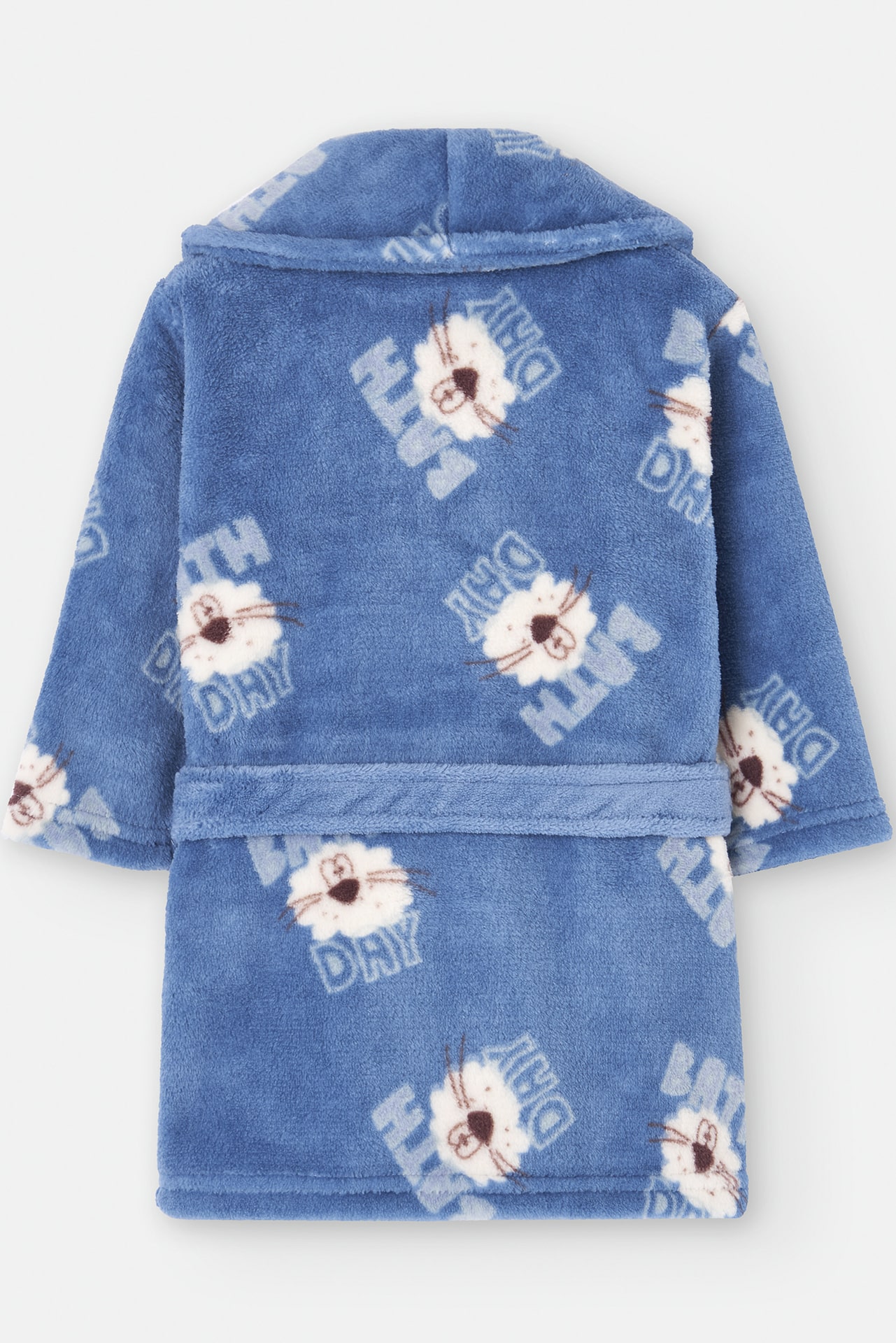 Bata infantil de bebé niño Waterlemon 7205. Diseño azul con caritas de osito y texto “Bath Day”, cierre con botones, cinturón y bolsillos.