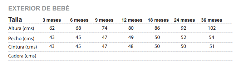 | Tallas Bebé | 6 meses, 12 meses, 18 meses, 24 meses, 36 meses |