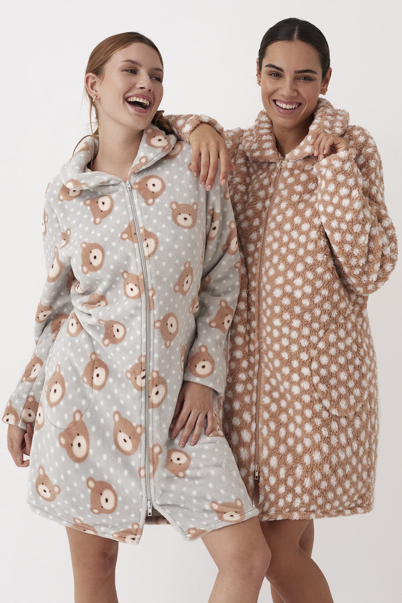 Bata de mujer Promise N20604 en tejido polar con capucha y estampado de ositos. Suave, cálida y perfecta para el invierno.