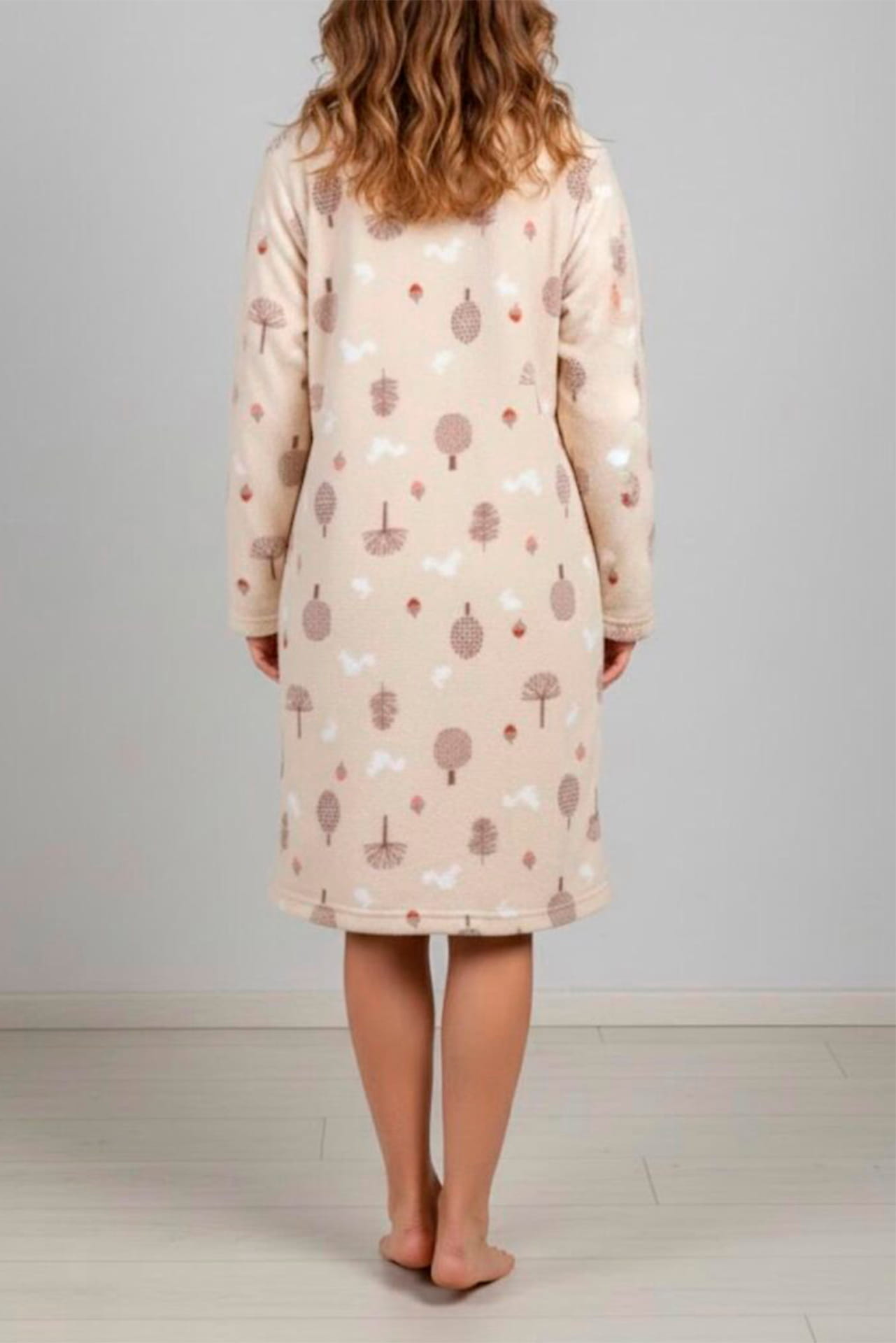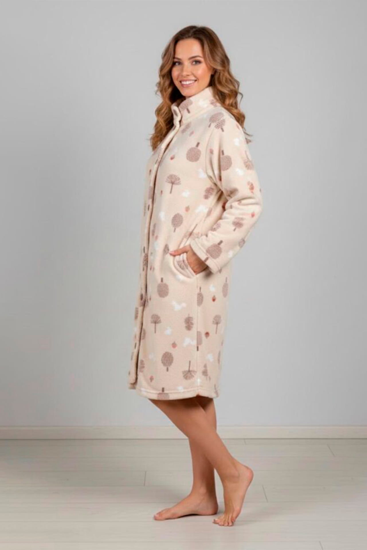 Bata de coralina suave y cálida, con estampado delicado en tonos naturales. Diseño abotonado por delante, con bolsillo frontal y manga larga sin puño