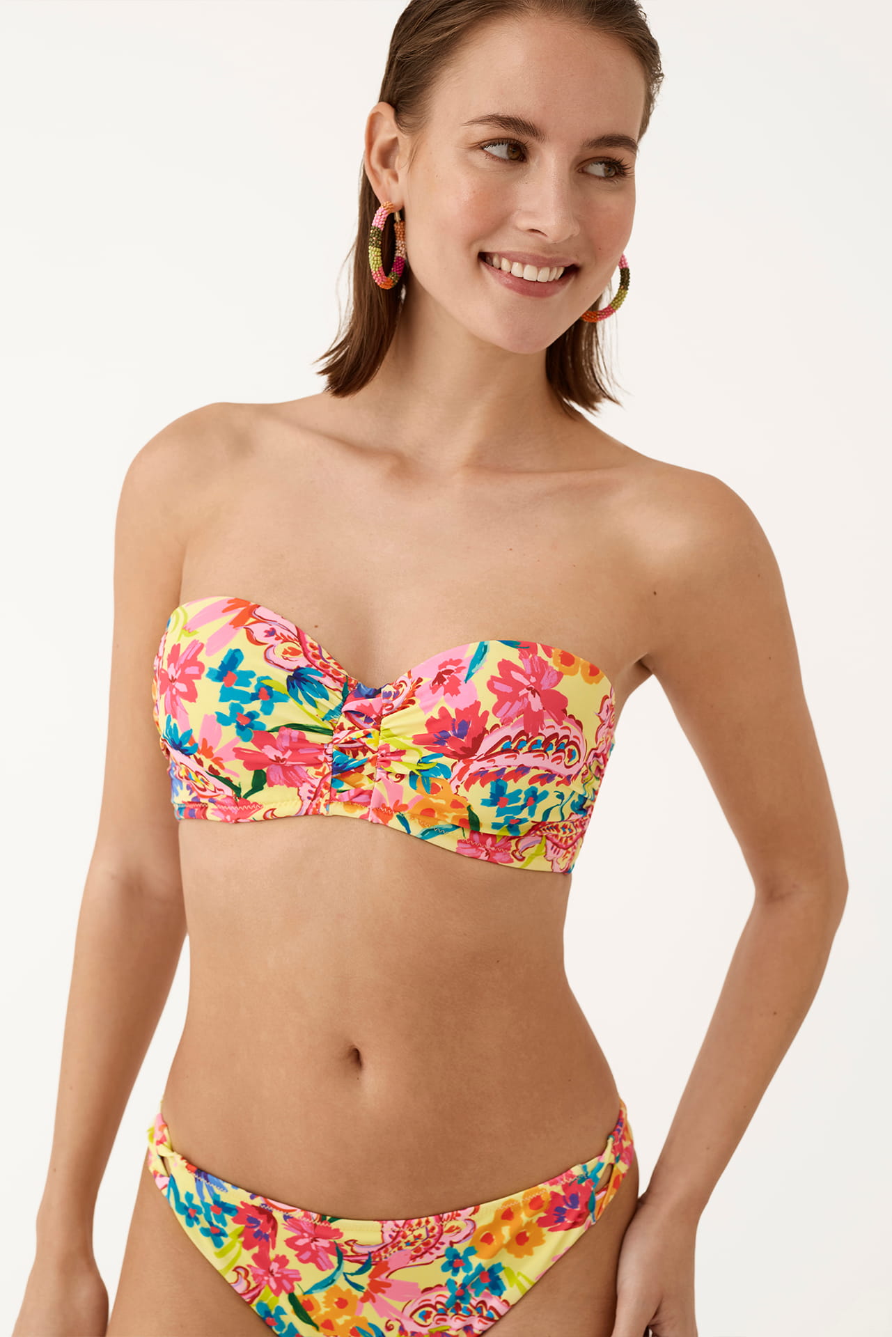 Bikini floral Promise S10730 con diseño bandeau, copa preformada y aros. Incluye tirantes extraíbles y braga con detalles laterales, perfecto para un look veraniego, colorido y versátil.