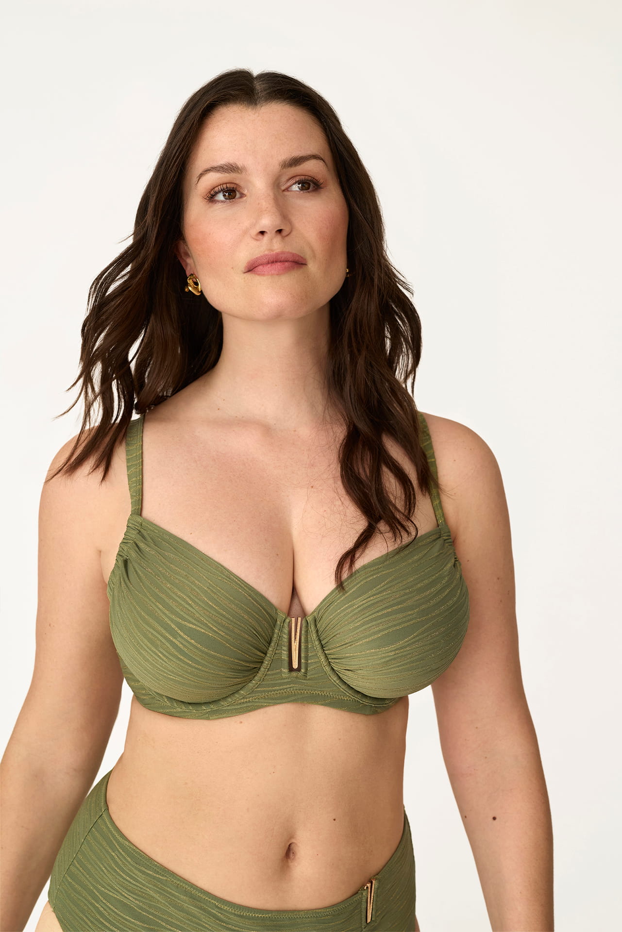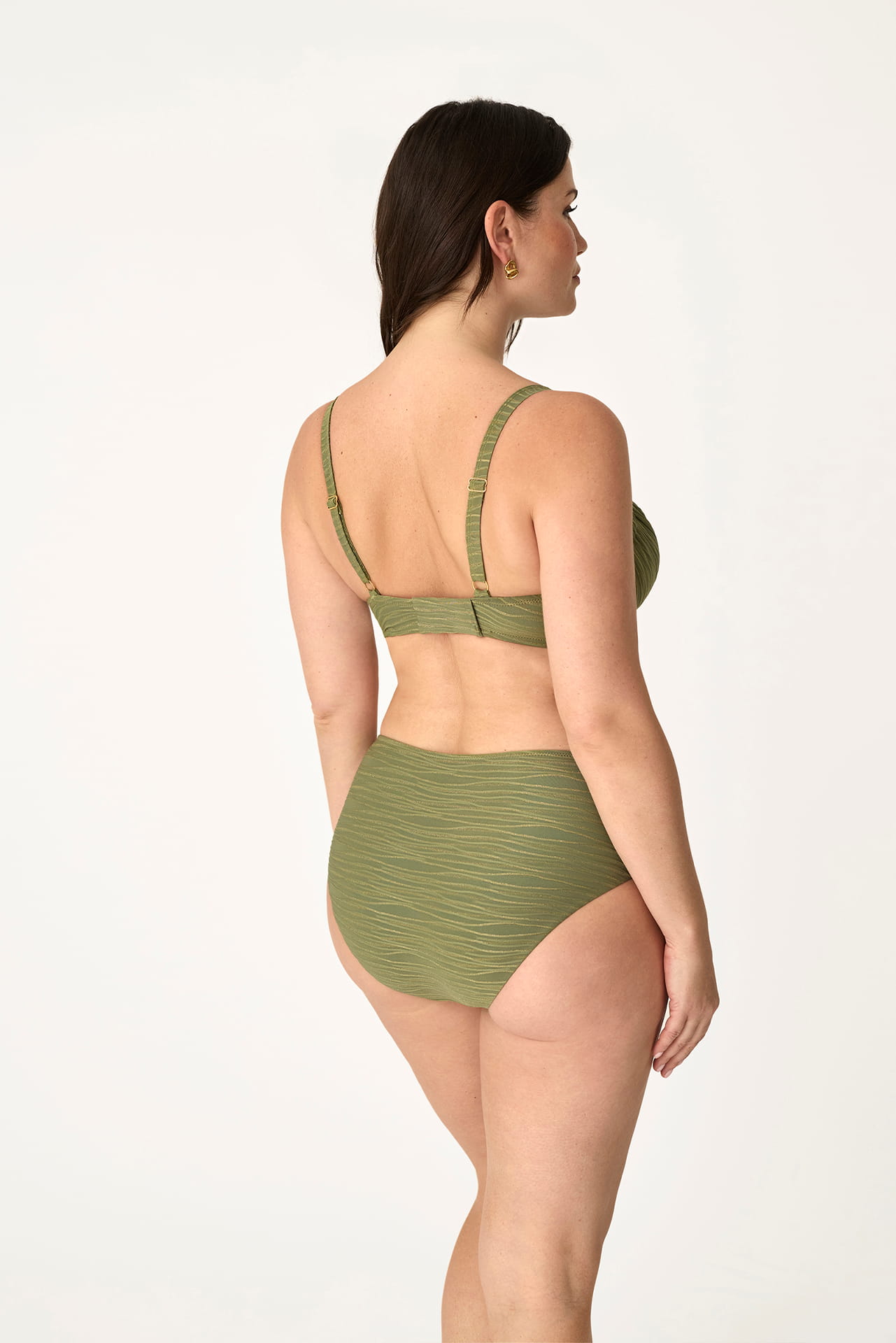 Bikini reductor Promise S10691 en color verde oliva con textura de ondas. Sujetador de gran capacidad con aros y braga de talle alto para una silueta definida, firme y sofisticada.
