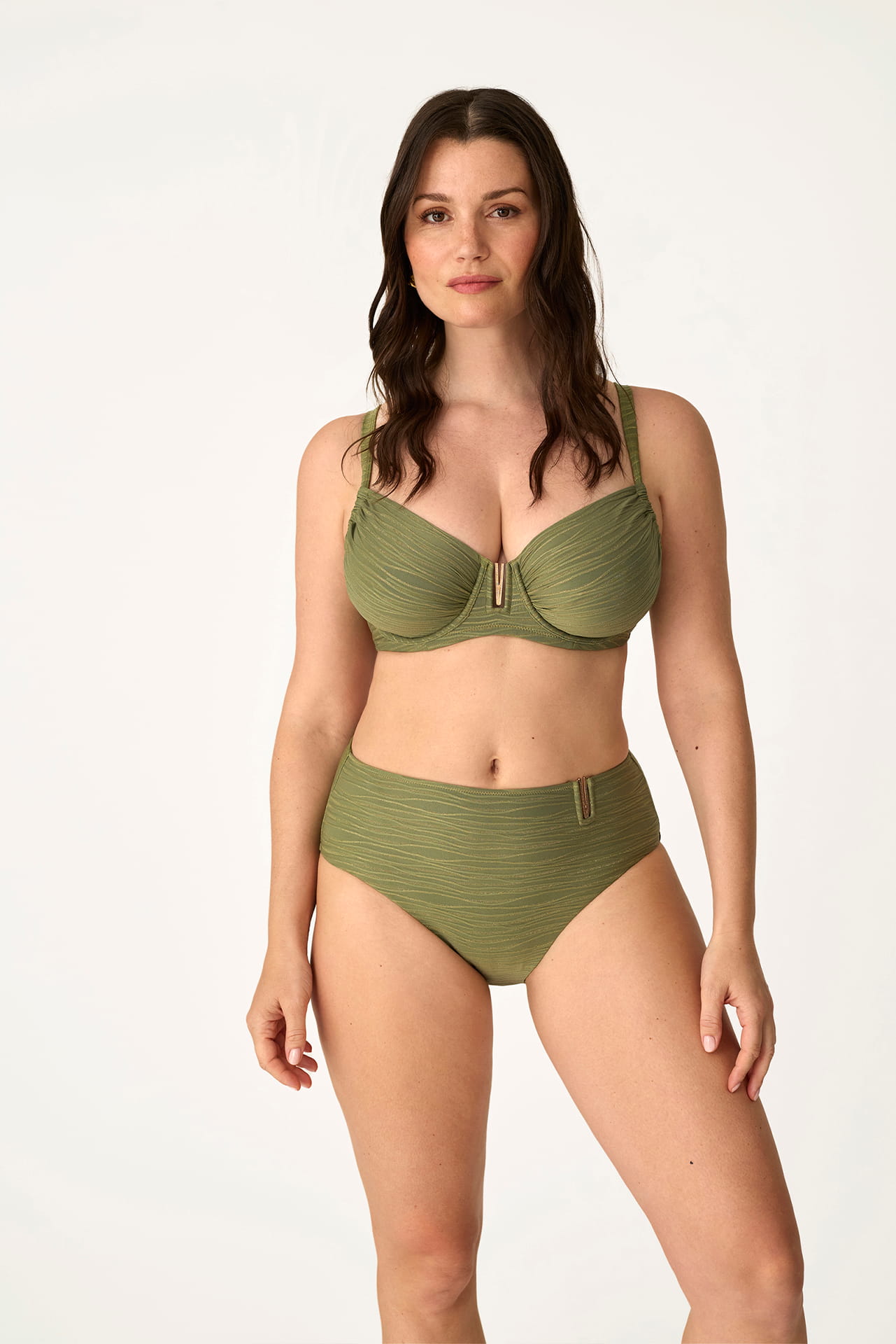 La parte inferior es una braga de corte brasileño, diseñada para estilizar la silueta y realzar las curvas de forma natural. Confeccionado en una microfibra elástica de tacto suave y secado rápido, este conjunto ofrece una comodidad excepcional y una alta resistencia al cloro y al sol.