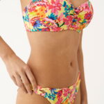 Bikini triangular Promise S10740 con estampado floral multicolor. Sujetador tipo cortina ajustable y braga brasileña con detalles laterales para un look veraniego, sexy y lleno de color.