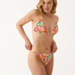 La parte inferior consiste en una braguita de bikini clásica con lazos laterales, lo que permite un ajuste perfecto a cualquier tipo de cadera sin oprimir. Los lazos también incorporan remates metálicos dorados a juego con el sujetador. Confeccionado en microfibra de alta calidad, este bikini asegura un secado ultrarrápido y una gran resistencia frente a la exposición solar y el cloro.