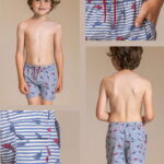 - Color: Rayas horizontales azul y blanco con estampado de peces rojos y azules.