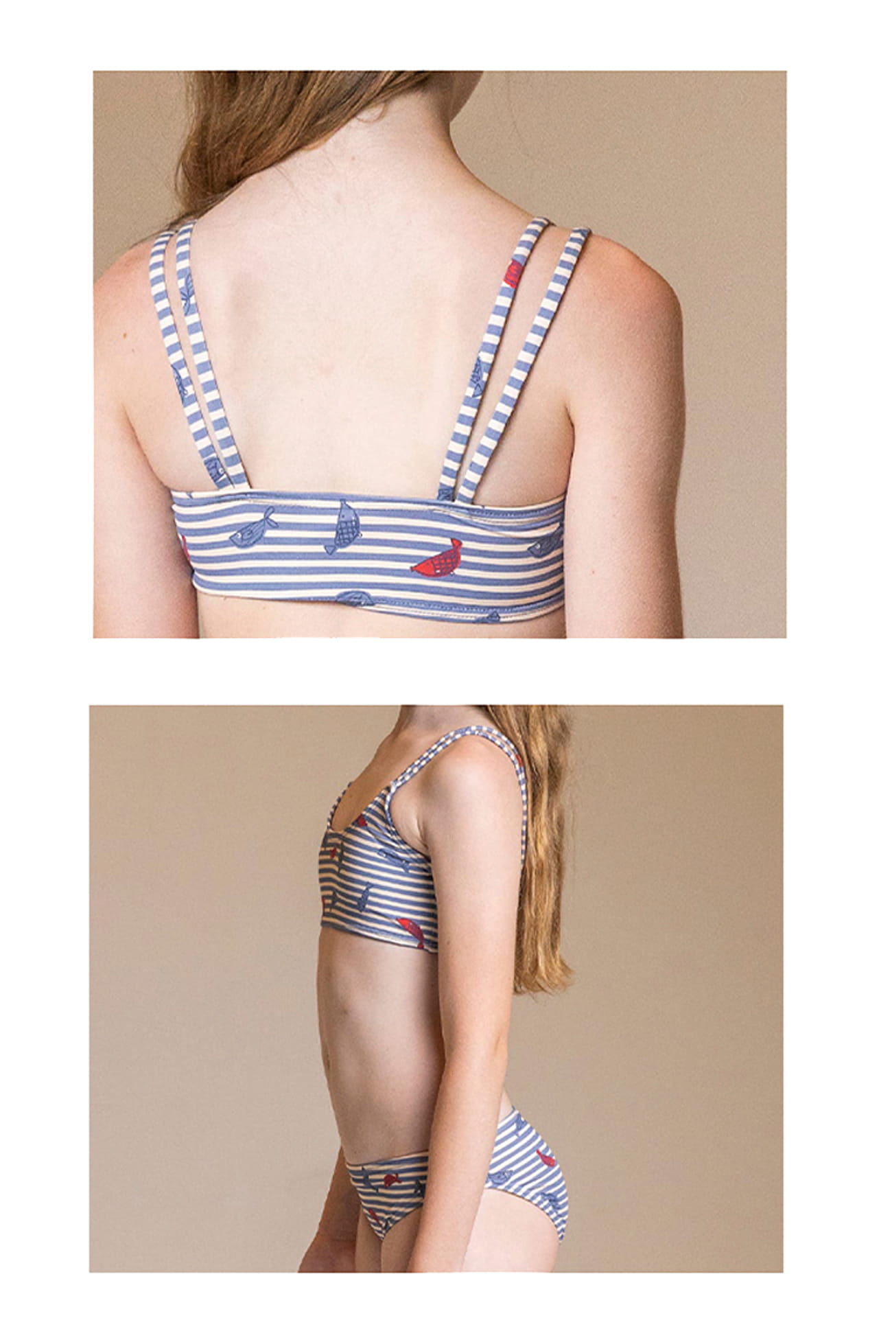 Bikini de niña Waterlemon «Kalimera». Diseño de dos piezas con estampado de rayas y peces, doble tirante para mejor sujeción y protección solar UPF 40+. Incluye copas extraíbles en tallas juveniles.