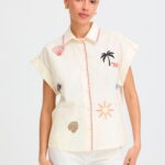 Blusa de manga corta con bordado suizo y cuello mao disponible en blanco roto