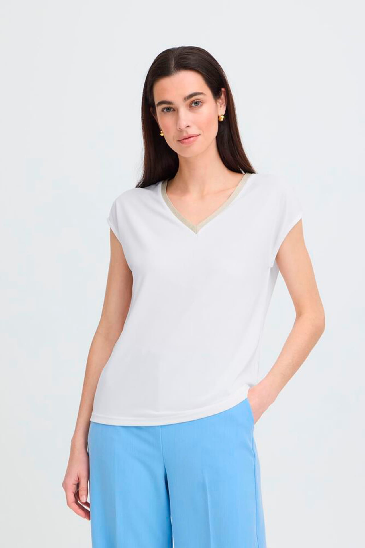 La camiseta b.young 20818705 es el básico esencial que eleva cualquier conjunto gracias a su sutil toque de brillo. Su diseño minimalista destaca por el elegante ribete de lúrex dorado en el escote en «V», que aporta luminosidad a la cara y transforma una prenda sencilla en una pieza perfecta tanto para el día como para la noche.