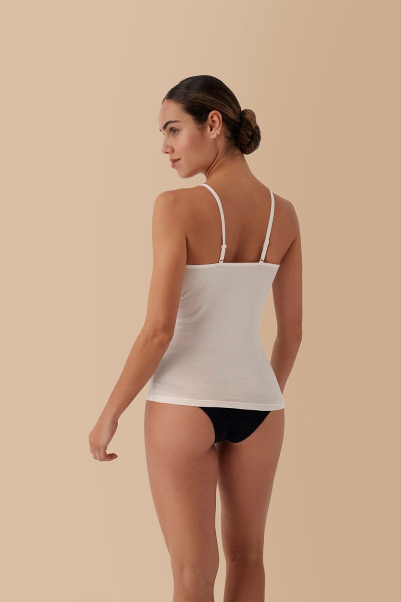 Su diseño con encaje en el escote y finos tirantes ajustables aporta un toque femenino y elegante, ideal para usar tanto como prenda interior como bajo jerséis o blusas.