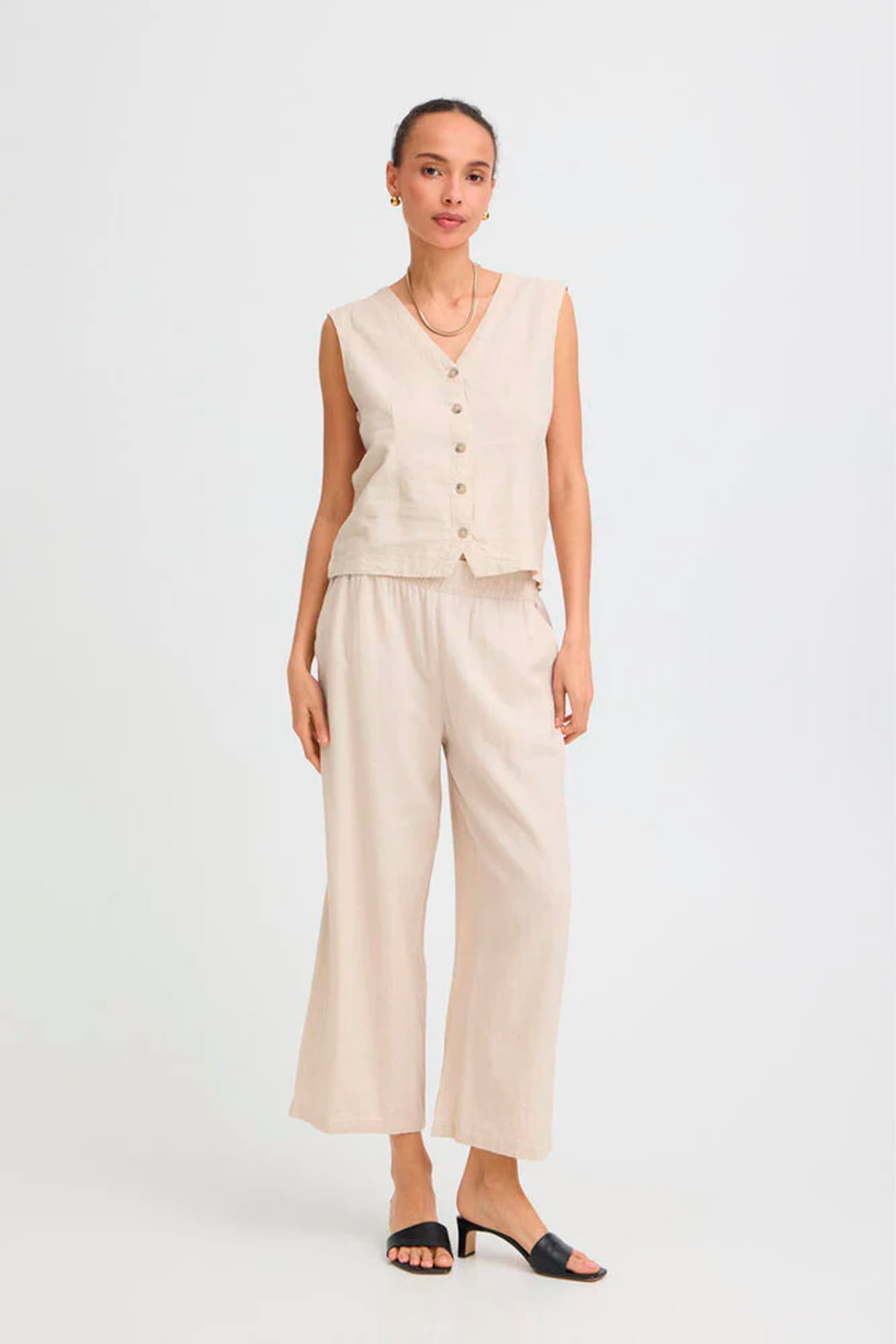 Chaleco sastre b.young confeccionado en lino y viscosa. Un diseño ligero con botones en color lino natural, ideal para combinar o llevar como top independiente con estilo y frescura.