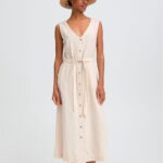 El diseño cuenta con un escote en «V» pronunciado, cierre frontal de botones clásicos y pinzas estratégicas que definen la silueta sin ajustarla en exceso, garantizando una caída fluida y cómoda.