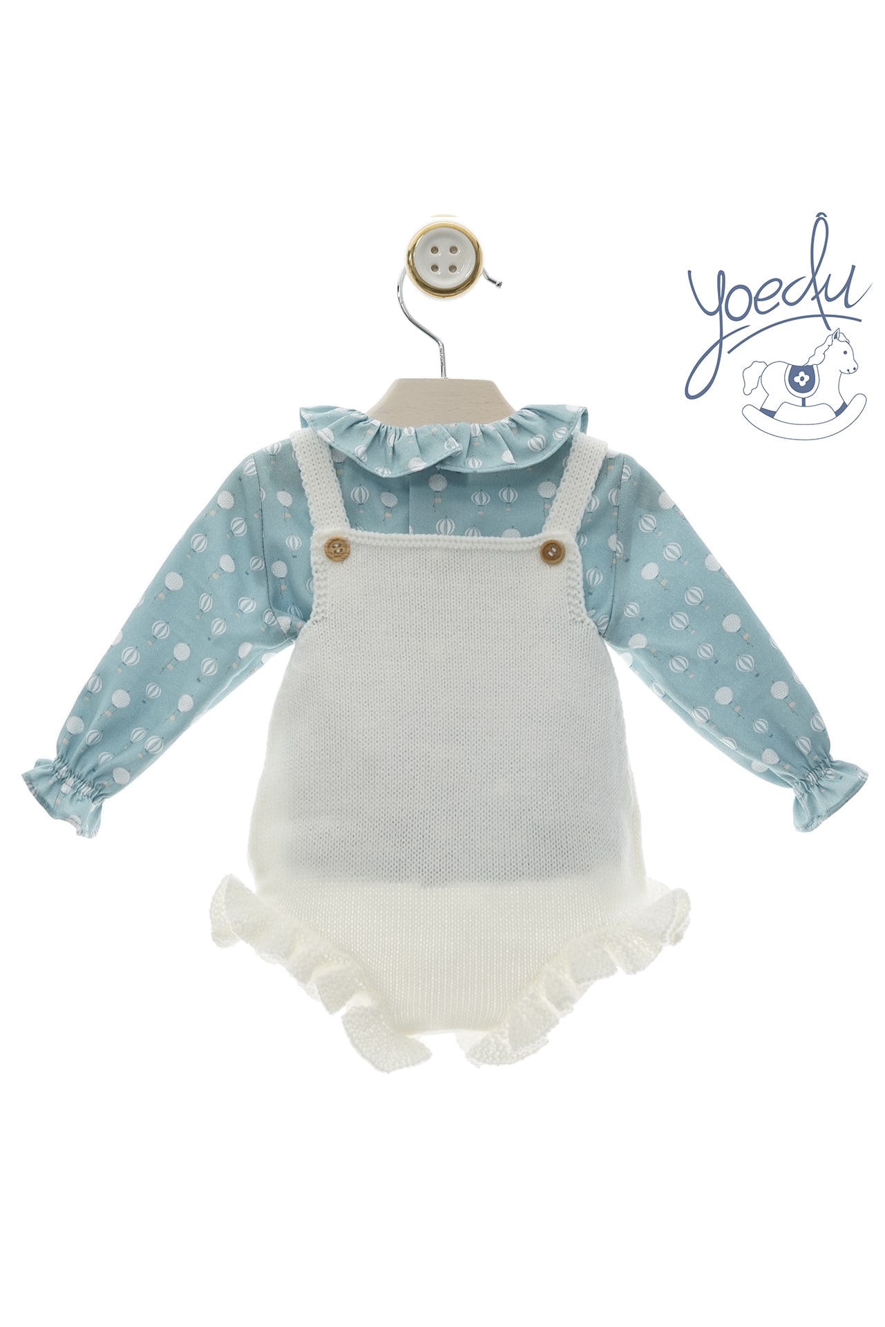 Conjunto Yoedu bebé niña de 2 piezas con blusa estampada en turquesa y ranita de punto blanca con volantes y globo aerostático.