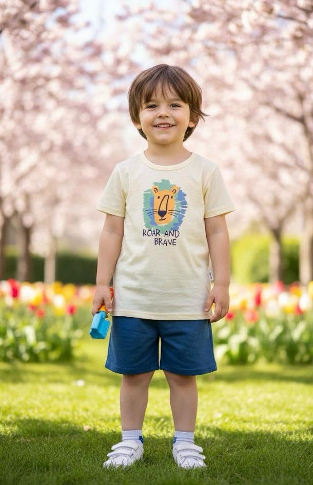 La camiseta en tono beige suave presenta un divertido estampado frontal de león con el mensaje “Roar and Brave”, aportando un toque alegre y motivador al look. Está confeccionada en un tejido ligero y transpirable que cuida la piel del niño y garantiza confort durante todo el día.