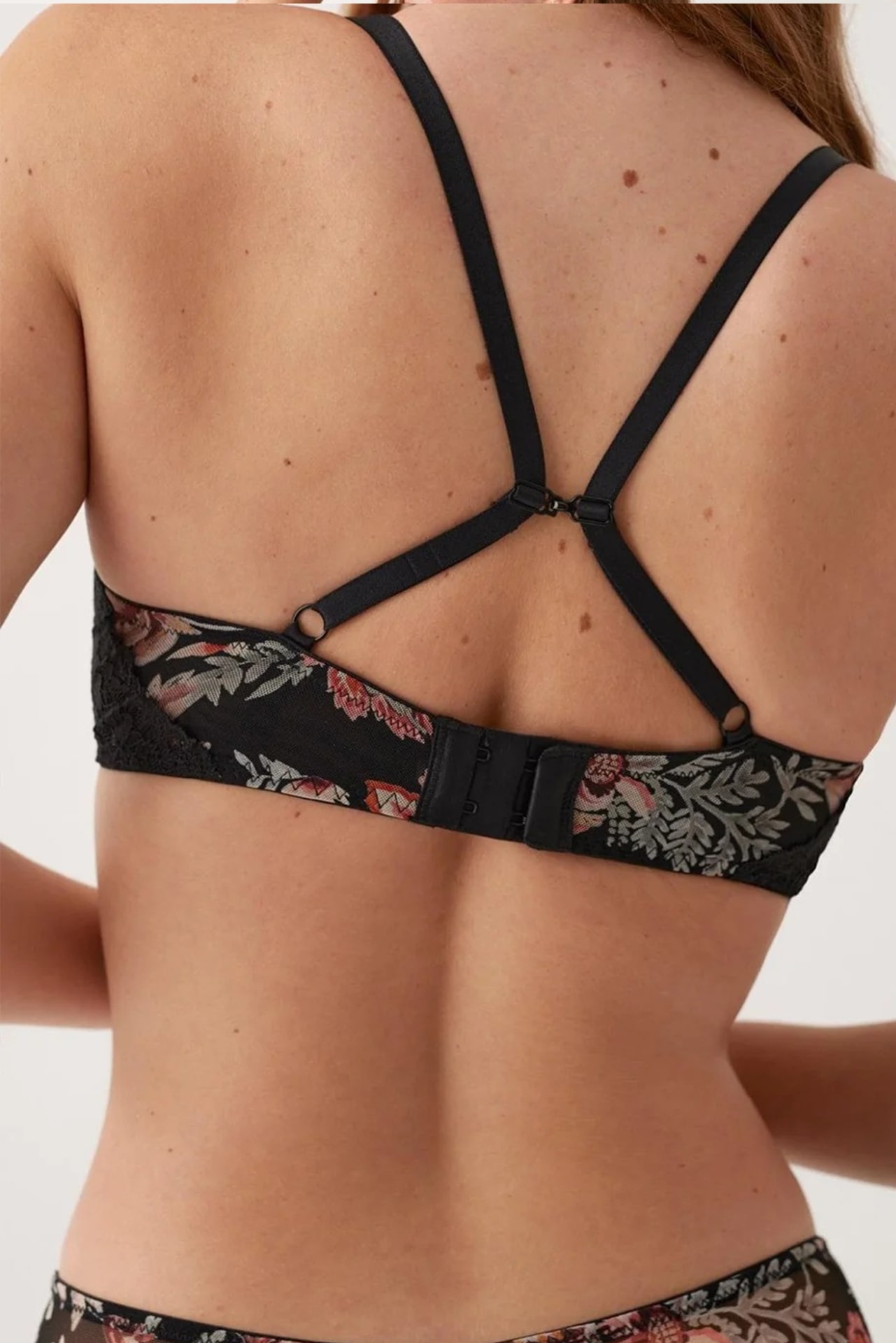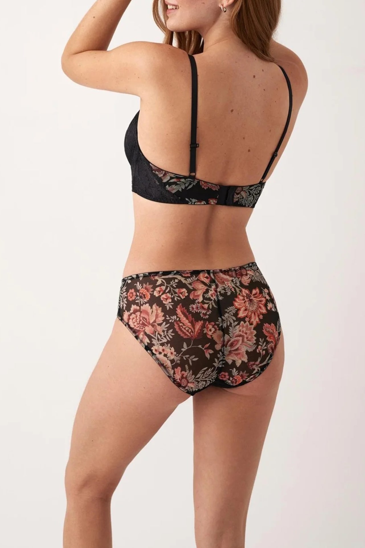 El bikini a juego presenta un delicado estampado floral sobre fondo negro, con transparencias de tul que le dan un aire sensual y refinado. Su tejido suave y adaptable garantiza un ajuste perfecto.