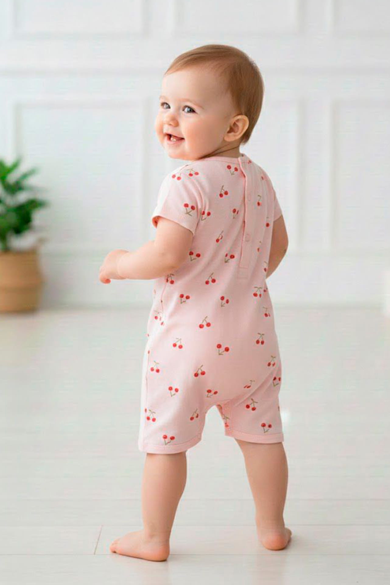 Diseñado en delicado tono rosa con divertidas cerezas y la frase “My Tiny Cherry” en el pecho, cuenta con mangas y piernas cortas para mantenerla fresca y libre para gatear o dar primeros pasos.