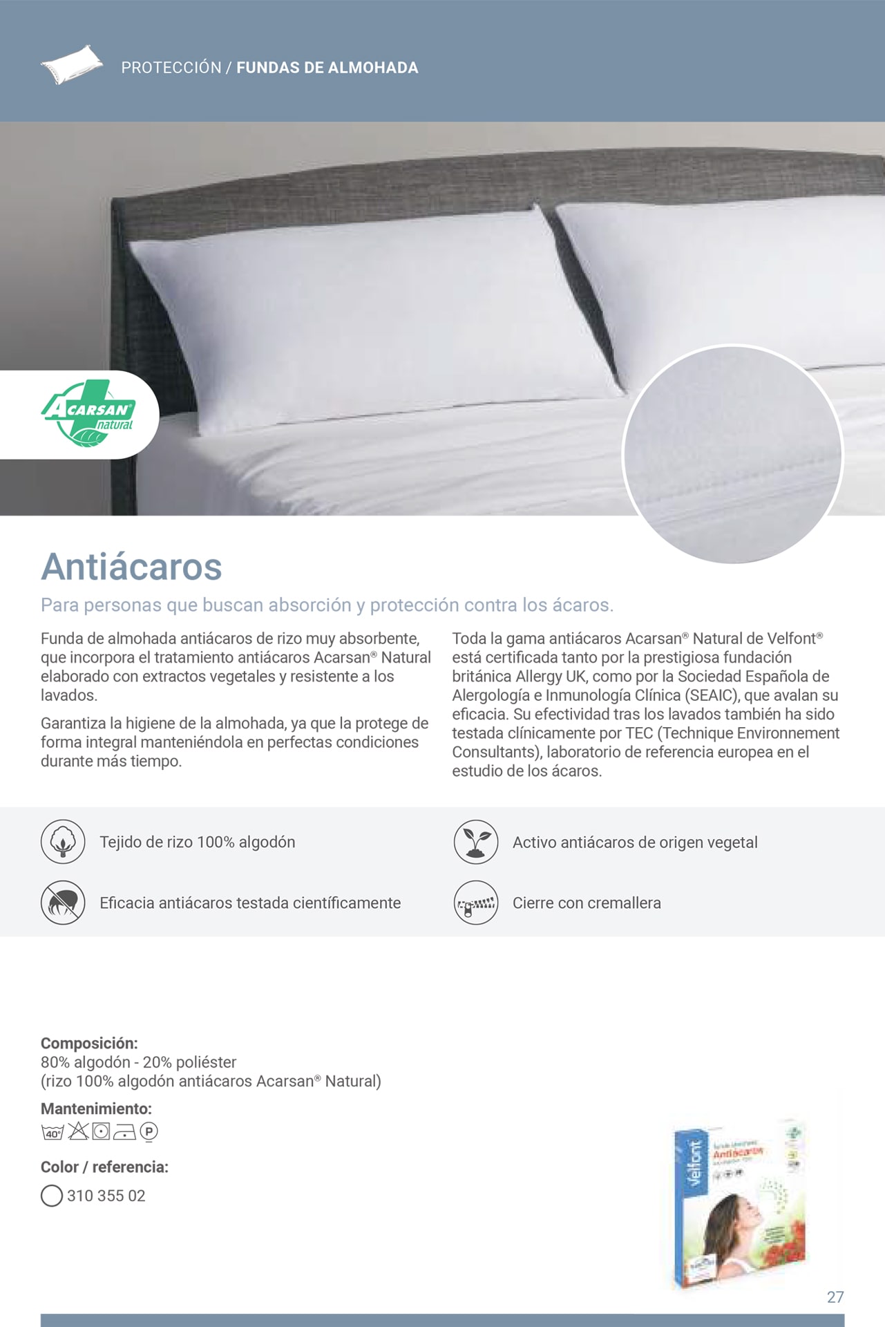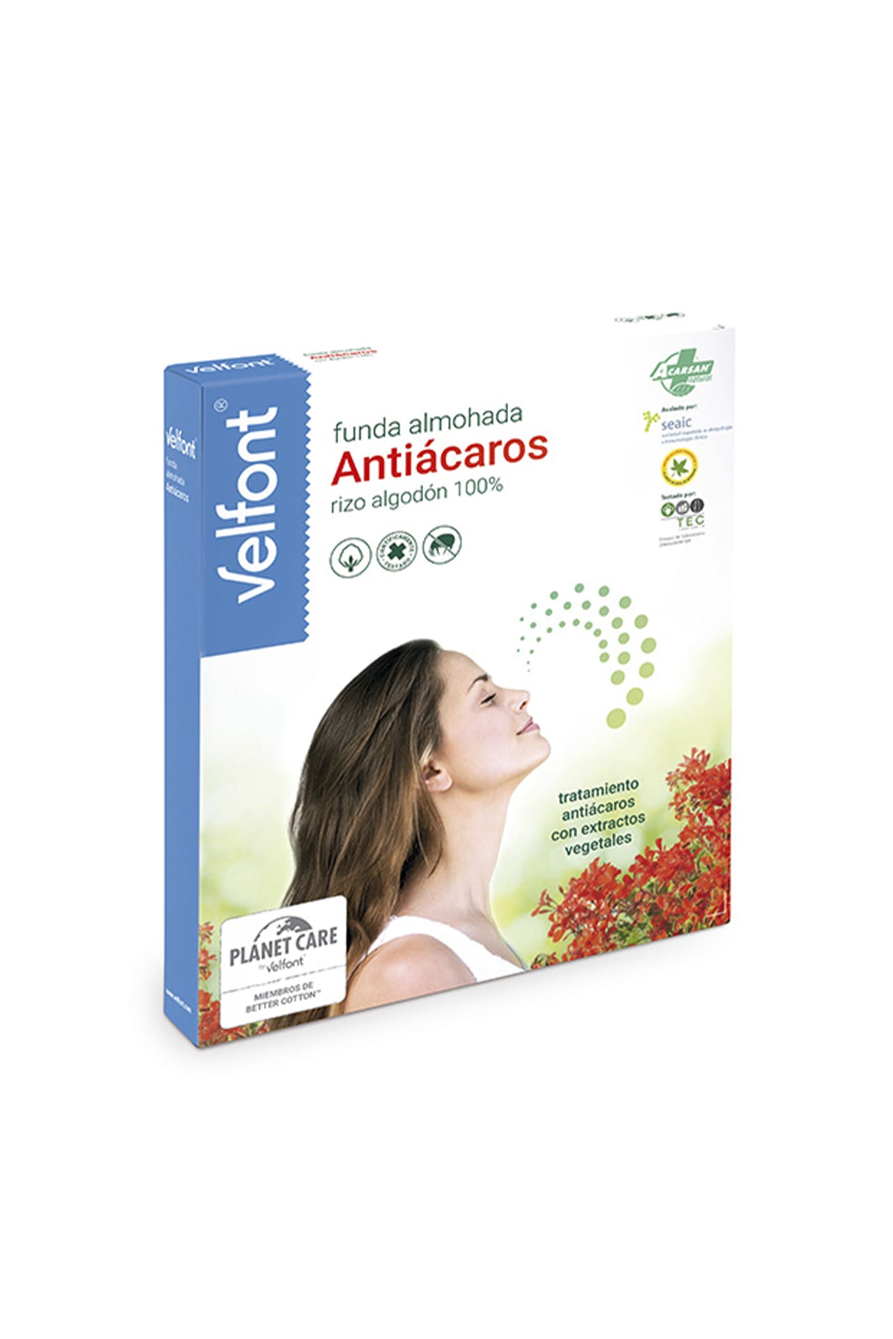 La Funda de Almohada Rizo Antiácaros Velfont está confeccionada con tejido rizo 100 % algodón, natural, suave y altamente absorbente.
