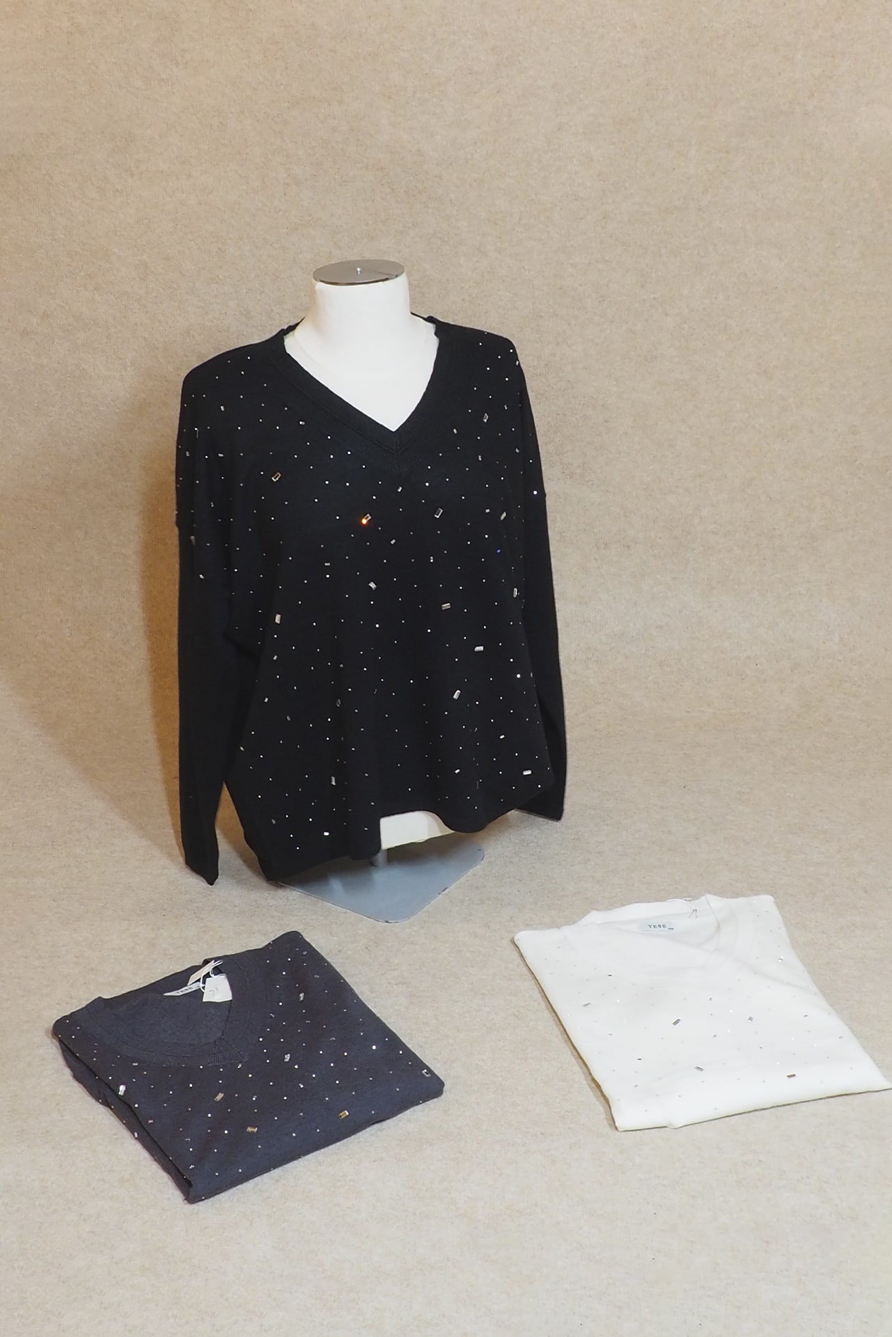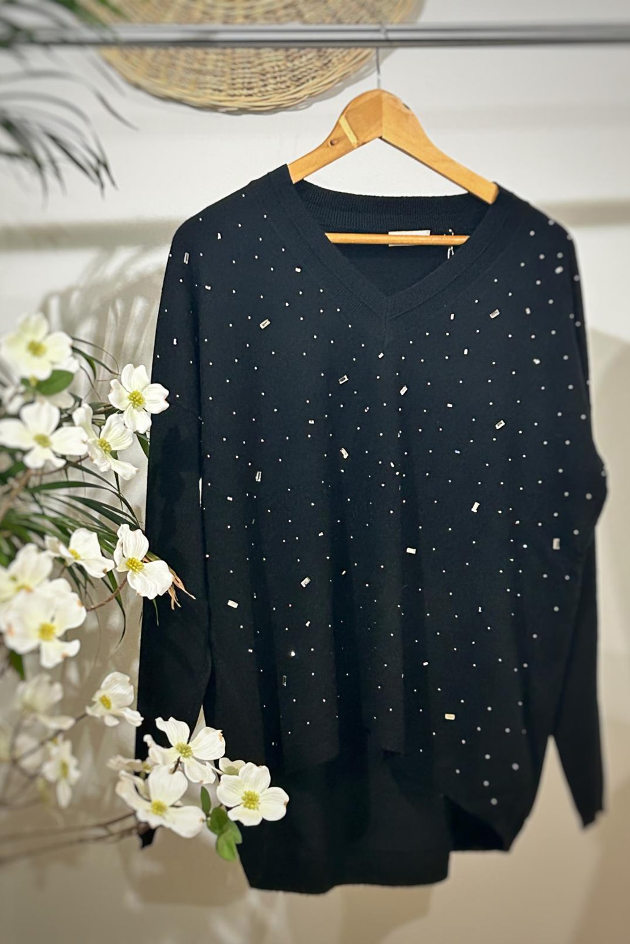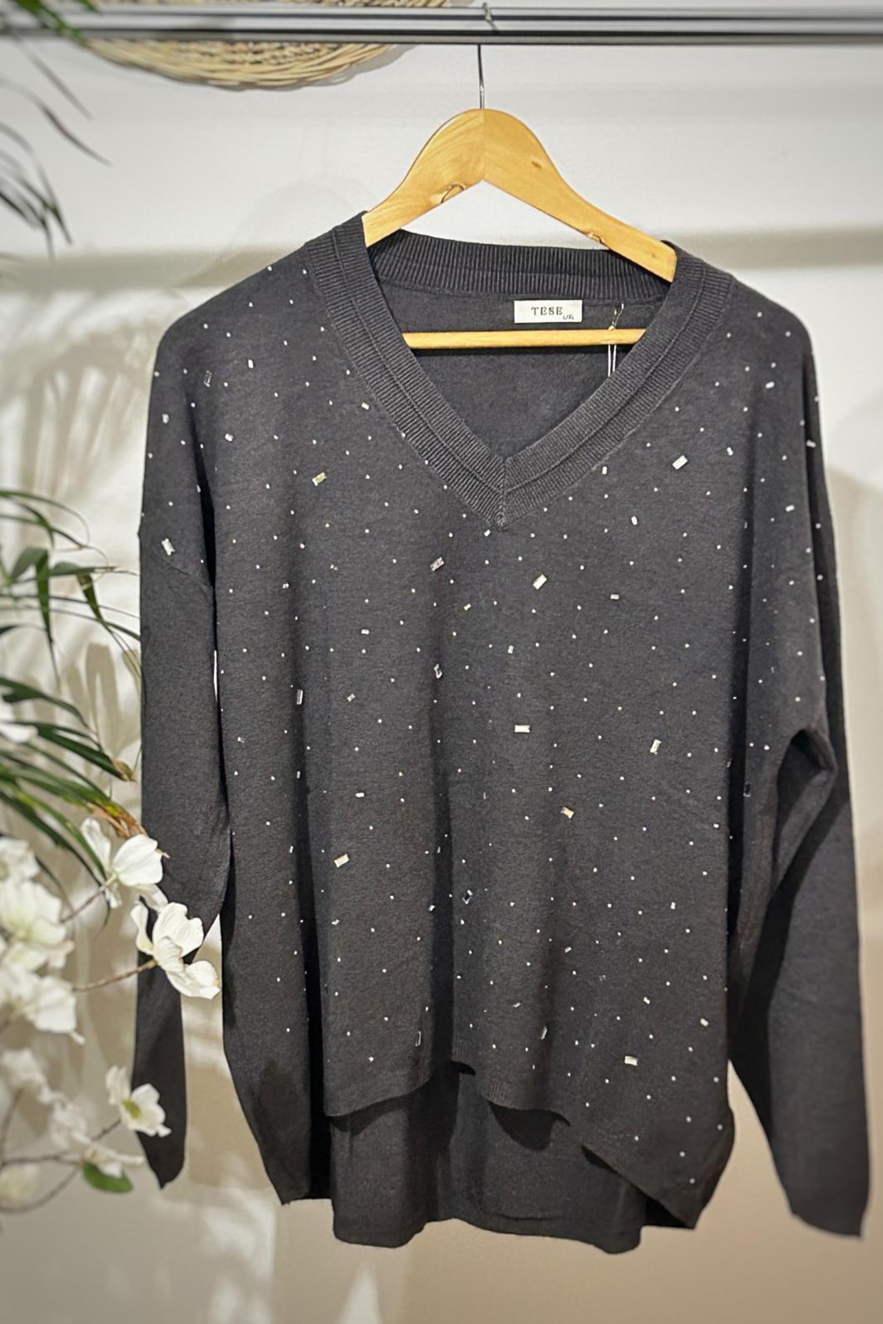 Jersey de mujer con cuello pico y detalles brillantes en la parte delantera. Disponible en gris, negro y marfil. Elegante, cómodo y versátil.
