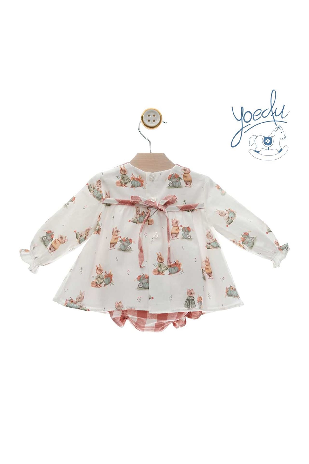 Jesusito Yoedu bebé niña 3 piezas en algodón, con estampado infantil, braguita a juego y lazo decorativo. Elegante, cómodo y de máxima calidad.