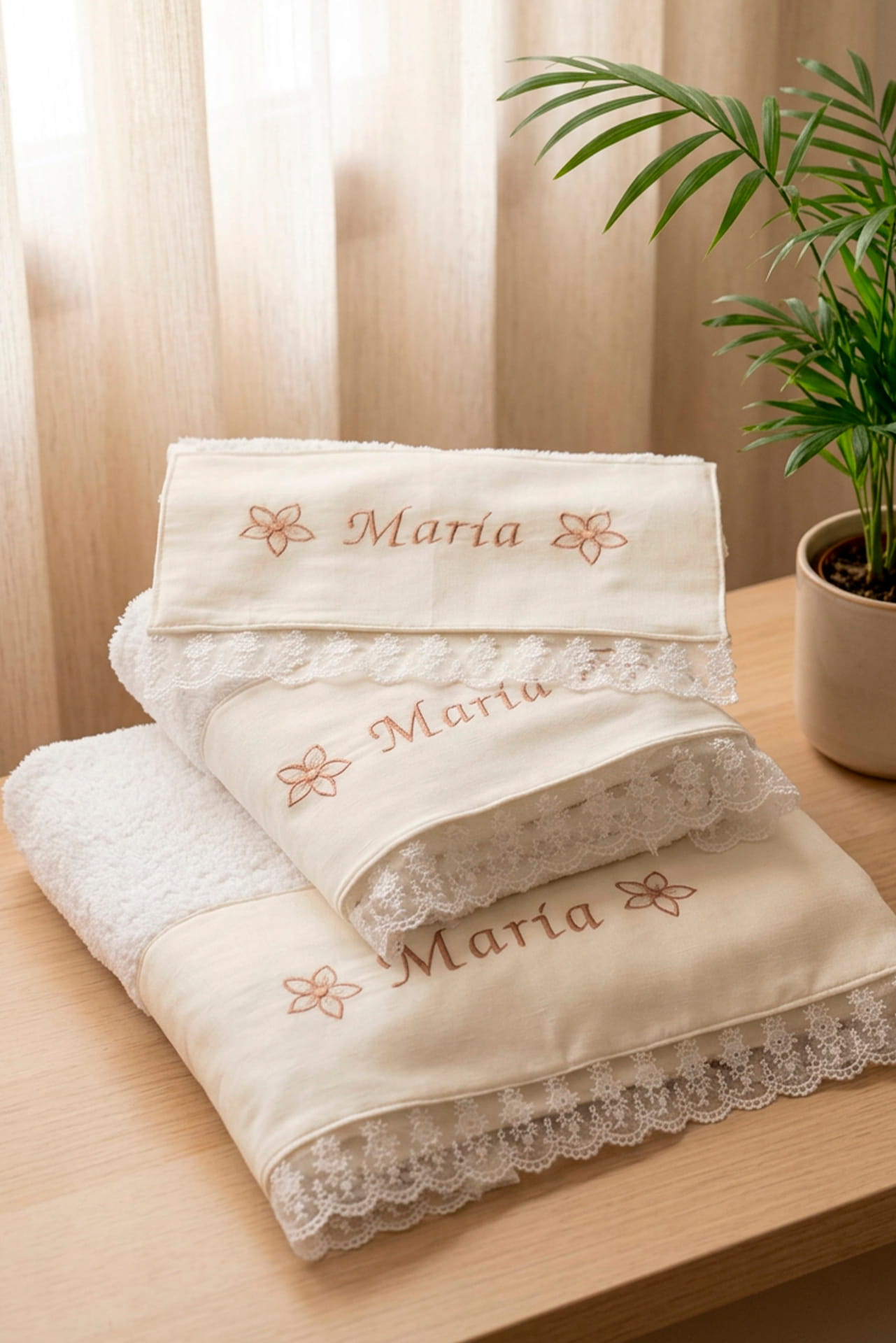 Puedes personalizarlas con nombre y/o diseño bordado que mejor encaje con tu baño o con el regalo que tengas en mente, creando un conjunto único y muy especial.
