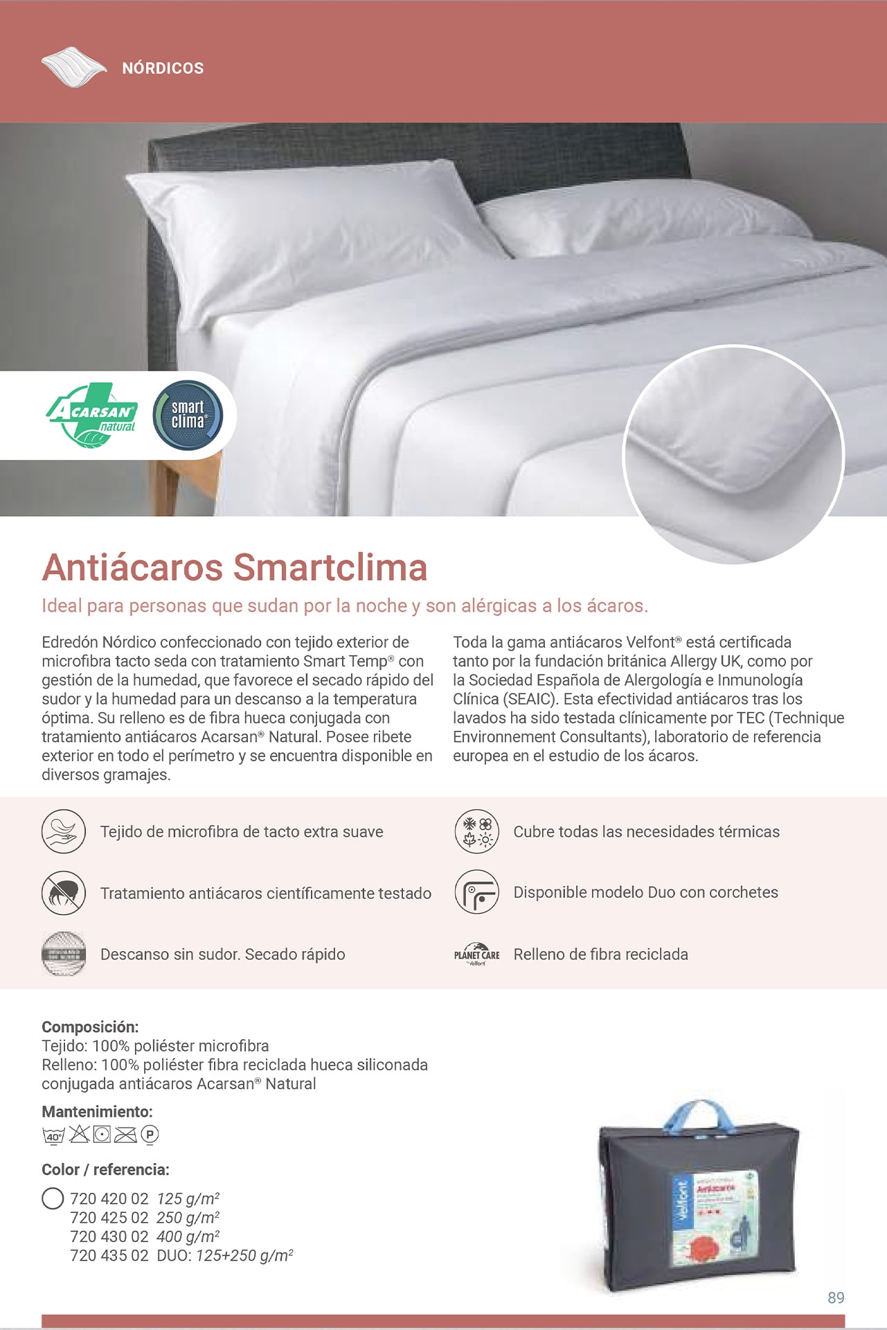 El nórdico dúo Antiácaros Smartclima de Velfont está compuesto por dos edredones independientes (uno de 125 g/m² y otro de 250 g/m²) que pueden usarse por separado o unidos mediante corchetes, ofreciendo tres niveles de abrigo según la temporada:
