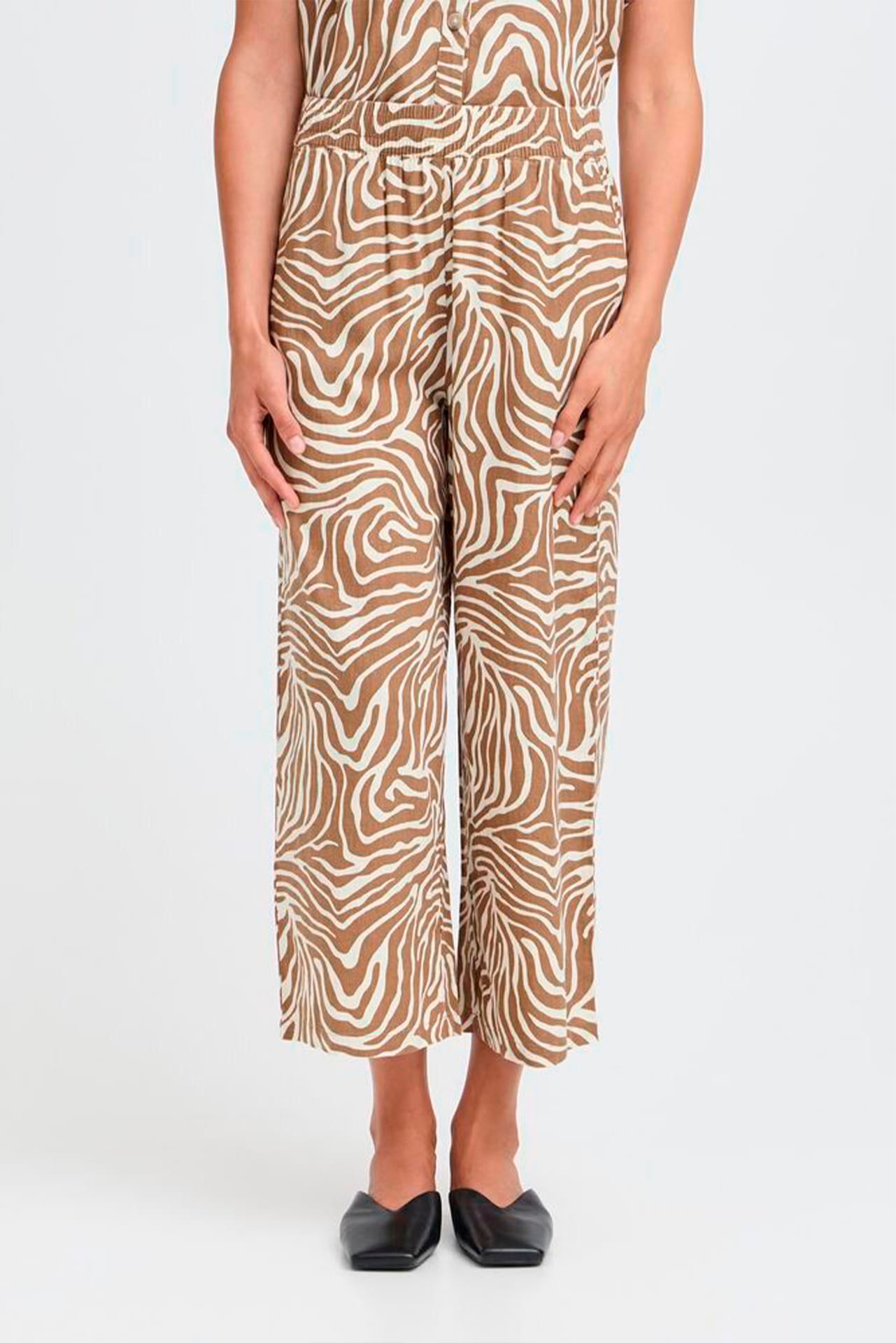 Pantalón b.young de corte crop y pierna ancha. Confeccionado en una fresca mezcla de lino y viscosa con estampado animal en tonos tierra. Comodidad y tendencia para tus días de calor.