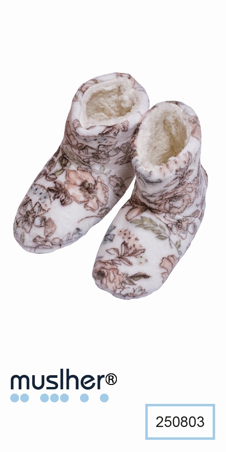 Pantuflas tipo botín con forro afelpado y diseño floral. Suaves, cálidas y elegantes: el confort que tus pies merecen