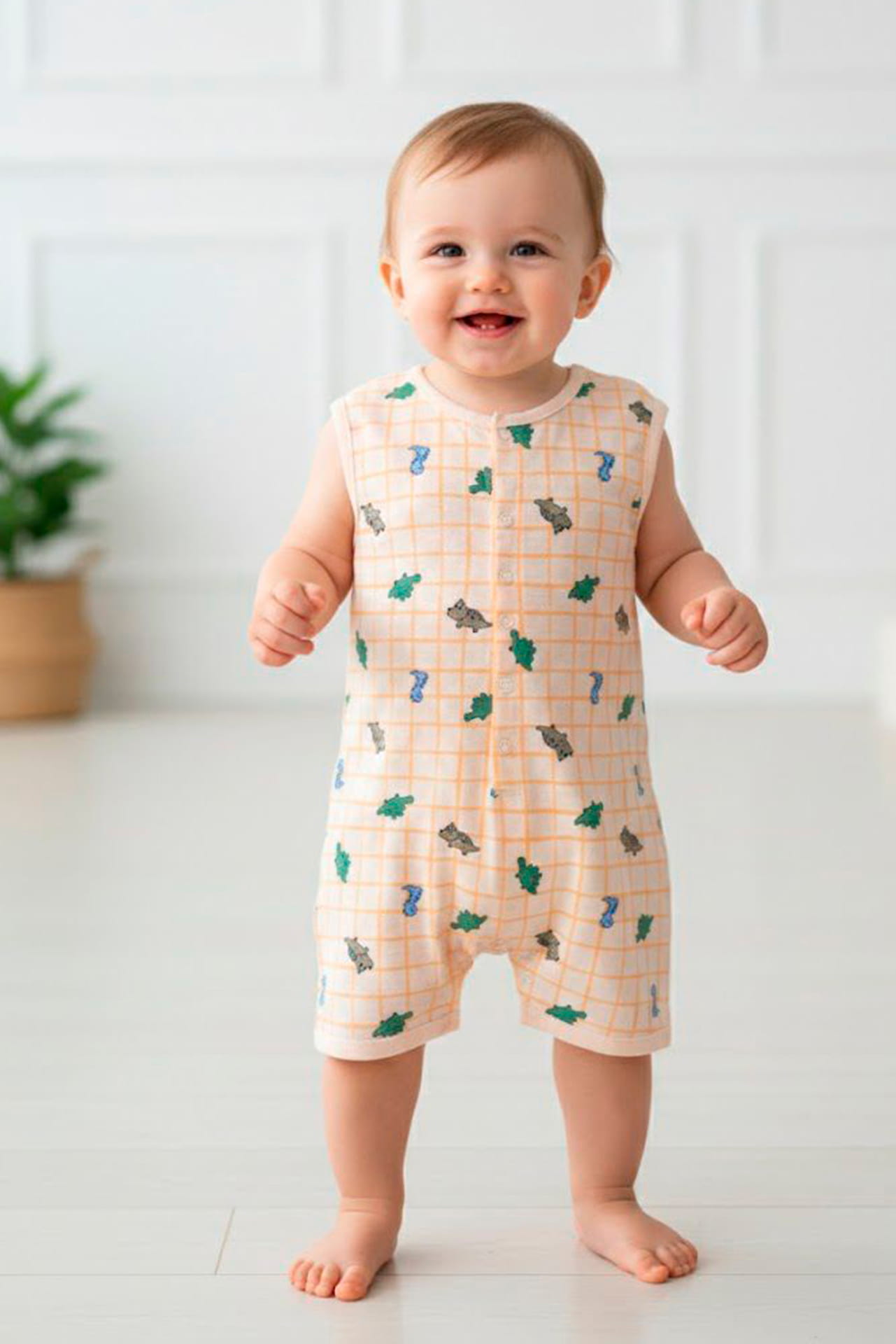 Confeccionado en 100% algodón con delicado estampado azul sobre fondo claro y finas líneas, asegura transpirabilidad y comodidad para la piel sensible mientras permite jugar o gatear con libertad.