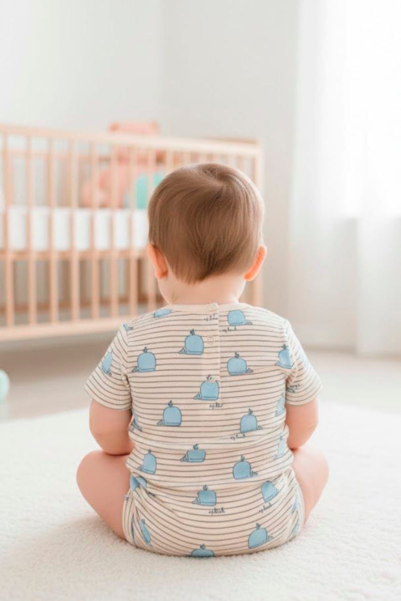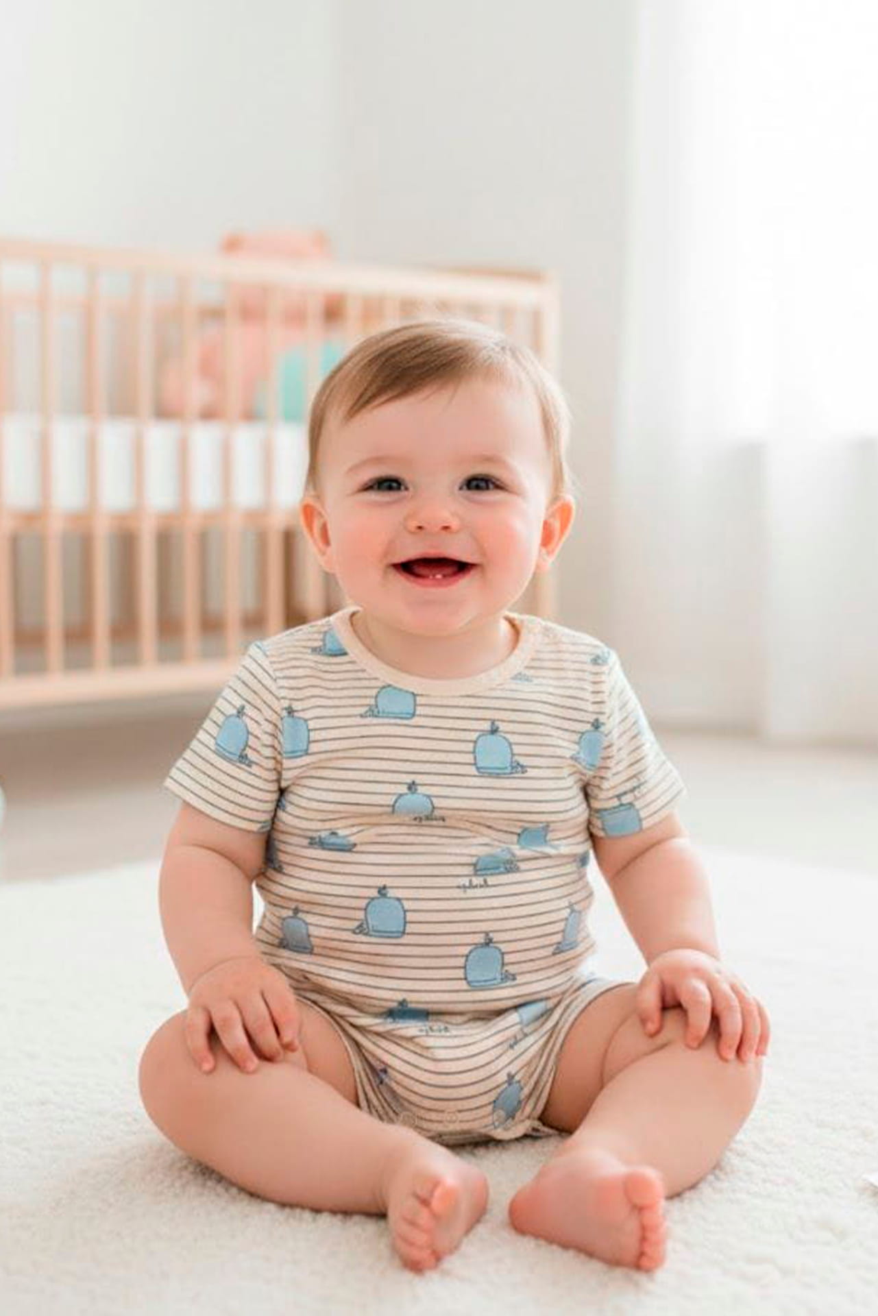 Confeccionado en 100% algodón con delicado estampado azul sobre fondo claro y finas líneas, asegura transpirabilidad y comodidad para la piel sensible mientras permite jugar o gatear con libertad.
