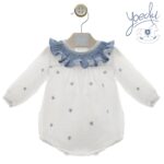 El diseño cuenta con canesú de punto en color verde empolvado con detalle de botones y remate en zigzag a contraste, que aporta un aire clásico y elegante. Dispone de cuello redondo, manga larga y cierre trasero con botones que facilita el vestir. El bajo elástico crea el característico efecto bombacho, proporcionando comodidad y libertad de movimiento al bebé.