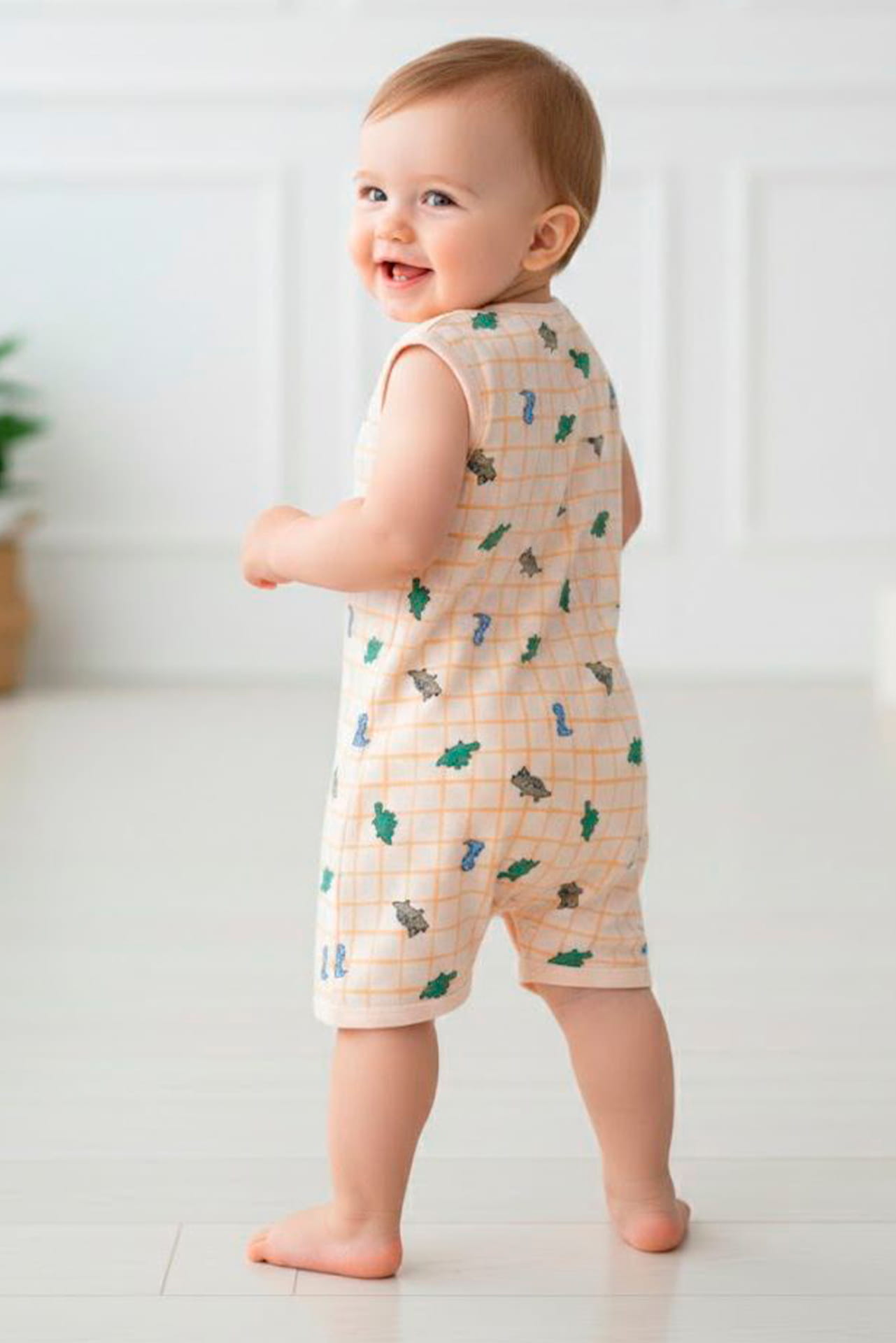 Confeccionado en 100% algodón con delicado estampado infantil, incluye botones frontales para facilitar el cambio de pañal y un corte amplio que asegura libertad de movimiento para gatear o primeros pasos.