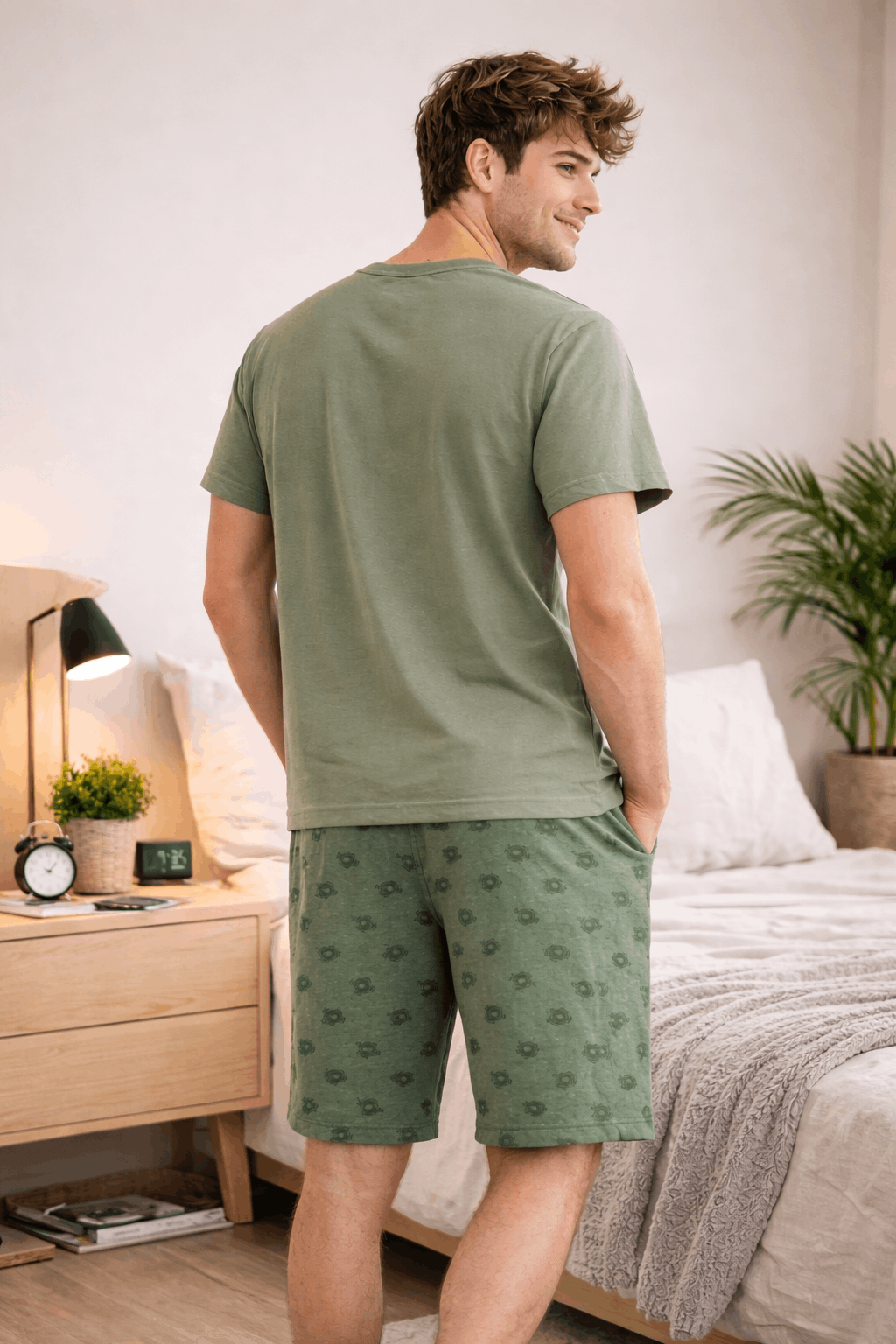 El pijama está compuesto por una camiseta de manga corta en color verde, con un pequeño dibujo frontal de estilo moderno, que aporta un toque juvenil y desenfadado. Se combina con un pantalón corto estampado con cintura elástica que se adapta perfectamente al cuerpo sin oprimir, ofreciendo libertad de movimiento.
