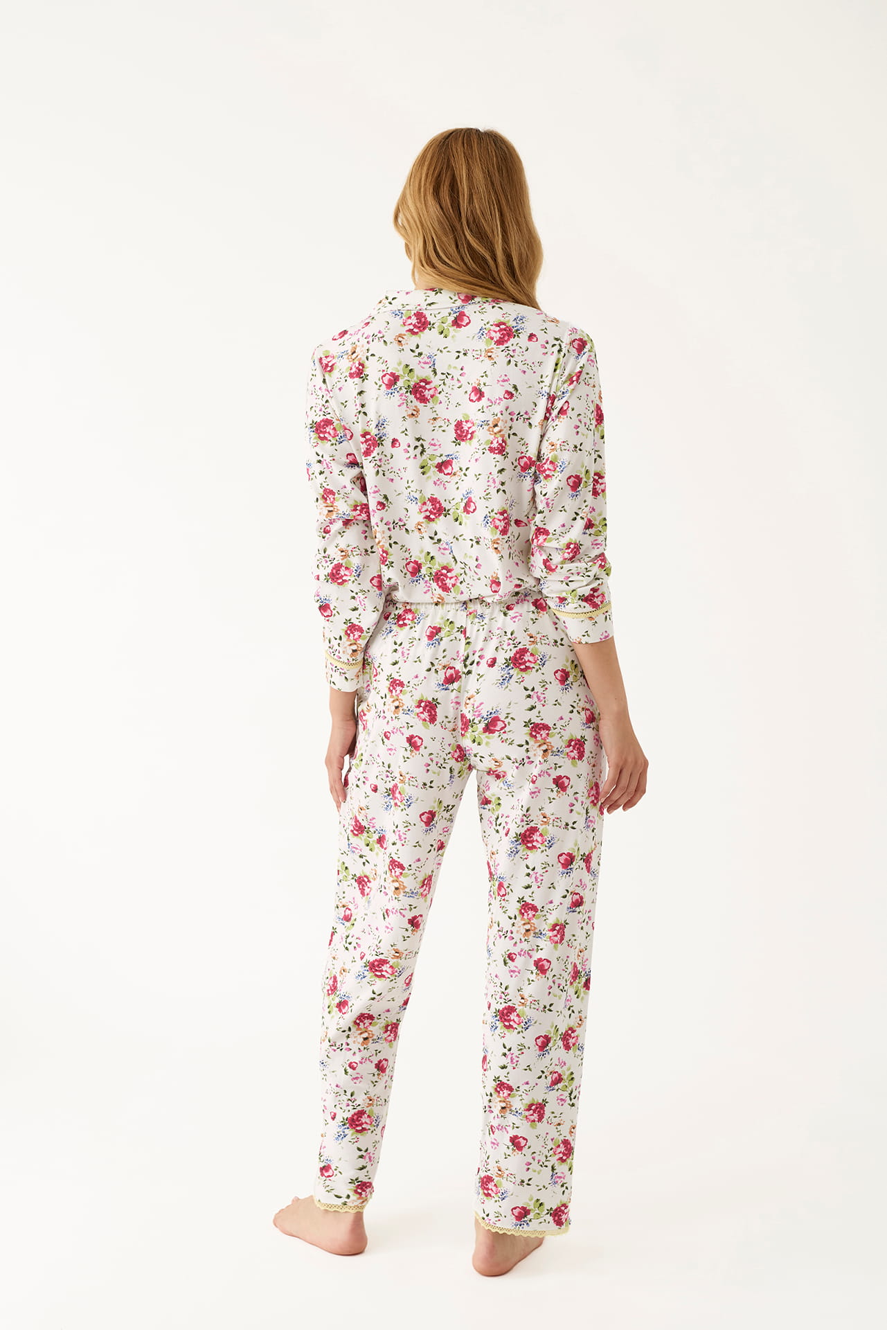 Pijama largo Promise N21092 tipo esmoquin con estampado floral. Camisa de botones y pantalón fluido en viscosa suave, con detalles de encaje lima para un look de hogar elegante y femenino.