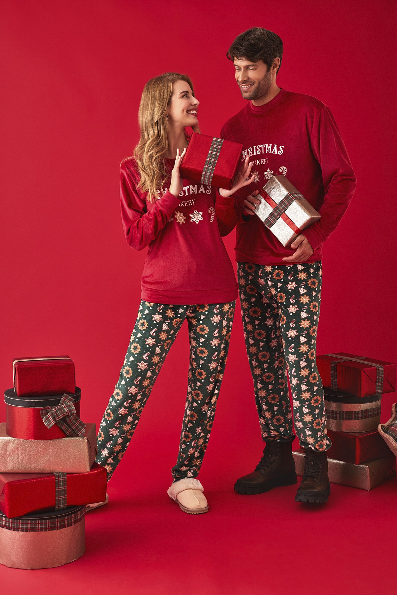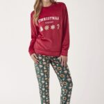 El pijama de hombre Promise H34752 está pensado para vivir la Navidad con el máximo confort sin renunciar al estilo. Confeccionado en terciopelo extrasuave, incluye una camiseta roja de manga larga con estampado frontal Christmas Bakery y simpáticos motivos de galletas navideñas, acompañada de un pantalón largo verde con un alegre estampado de estrellas, bastones de caramelo y figuras festivas.