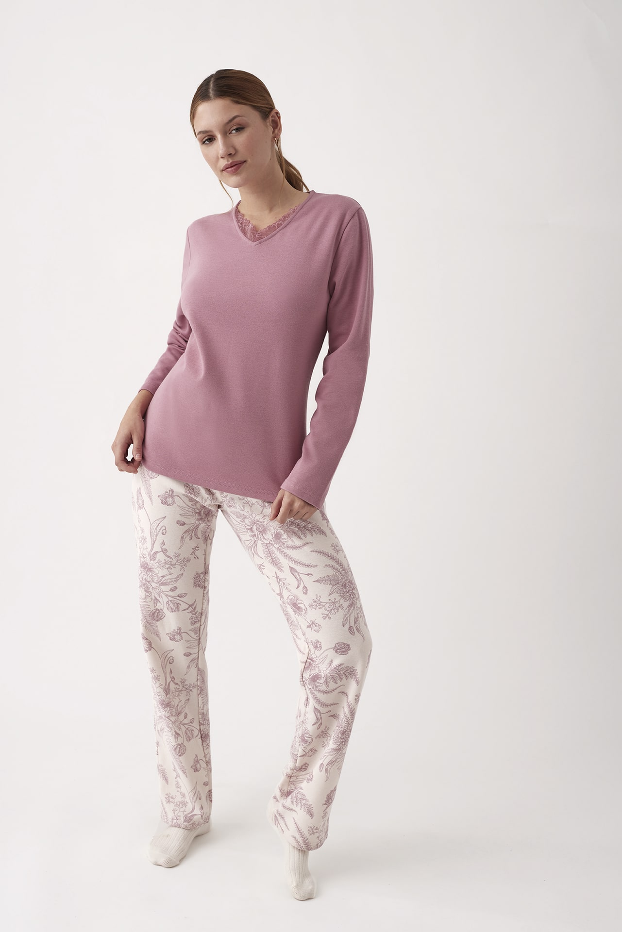 Pijama cálido de algodón perchado con chaqueta de coralina y pantalón floral