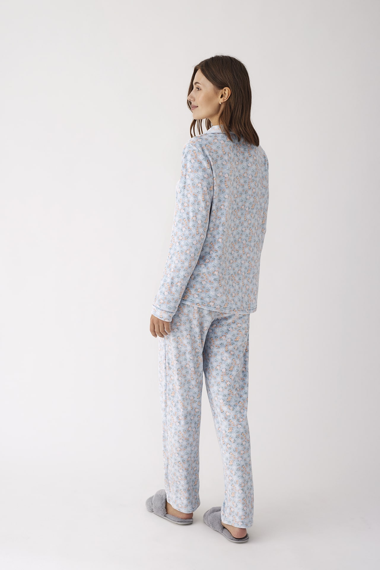 Confeccionado en suave terciopelo elástico, ofrece una textura cálida y envolvente con un bonito estampado floral en tonos pastel sobre fondo azul cielo. La camisa abotonada con cuello solapa y el pantalón largo recto aportan un toque sofisticado sin renunciar a la comodidad.