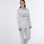 Pijama de mujer invierno gris con detalles en azul marino y mensaje “Sweet Dreams”. Tejido perchado cálido y suave. Cuello redondo y cintura elástica.