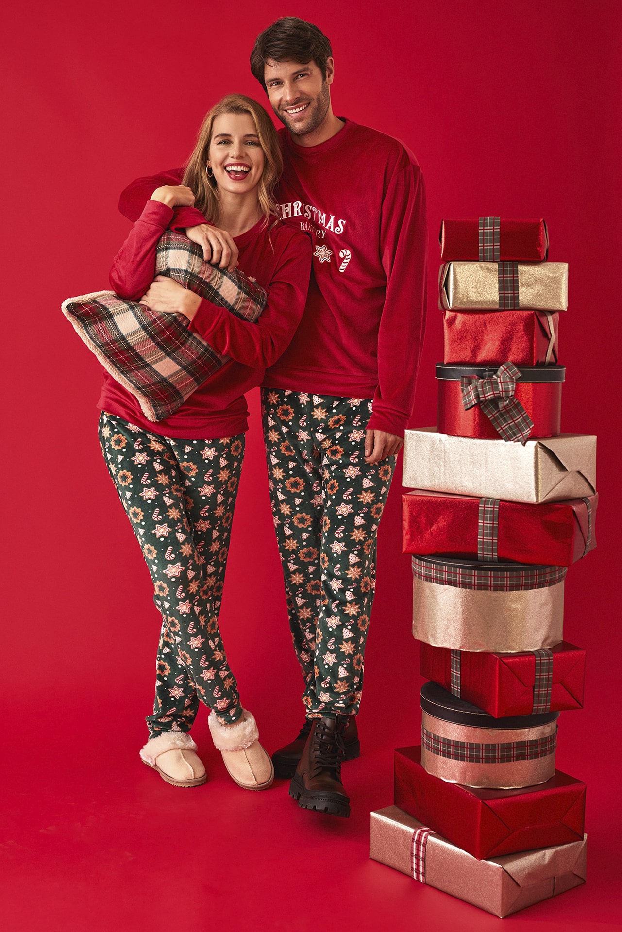El pijama de mujer Promise N20822 es perfecto para disfrutar de la Navidad con comodidad y estilo. Confeccionado en suave terciopelo, su diseño combina una camiseta roja de manga larga con estampado frontal Christmas Bakery y divertidas galletas navideñas, junto a un pantalón largo en tono verde con estampado de estrellas, muñecos y bastones de caramelo.