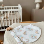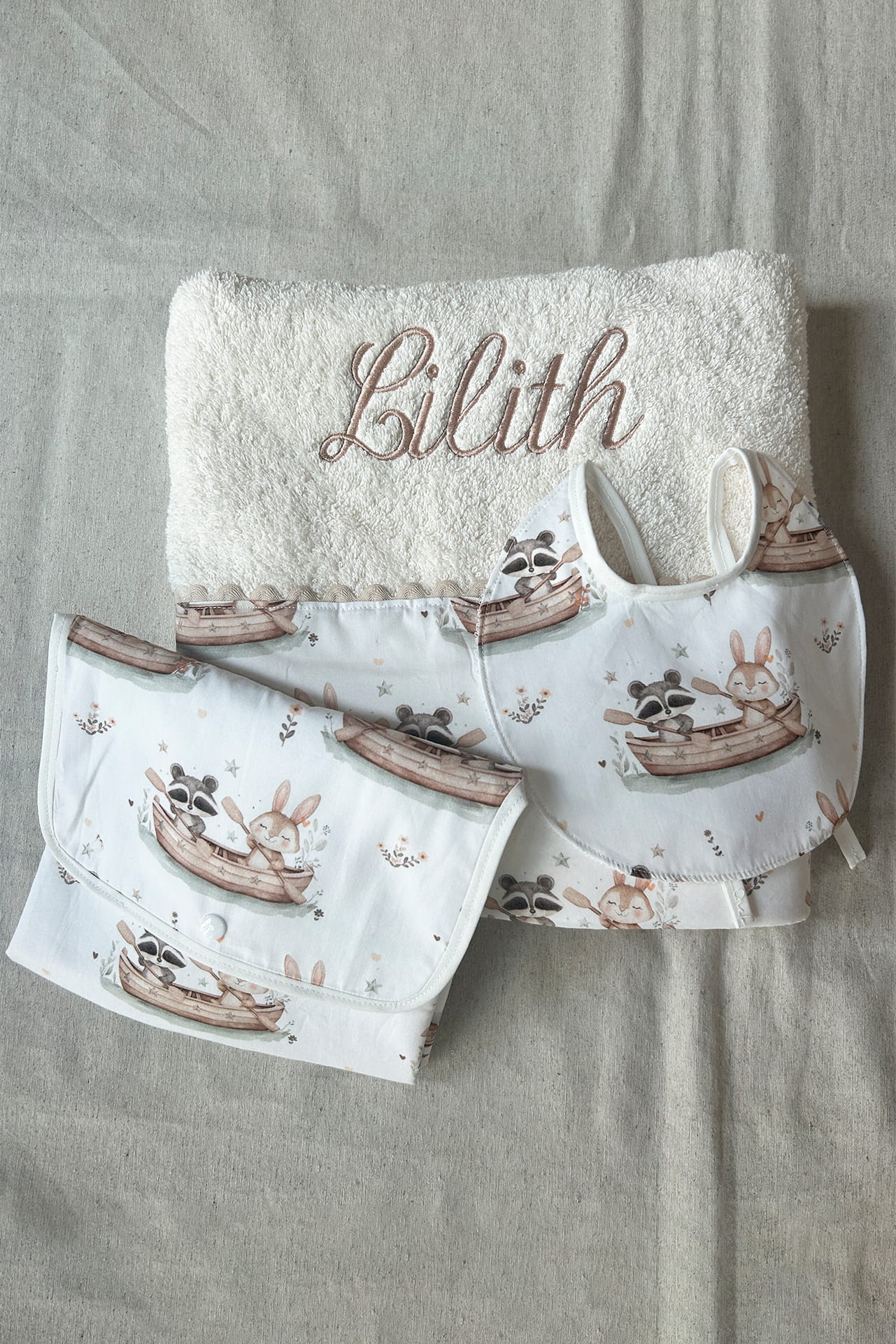Set bebé personalizado: toalla 70×140 cm, cambiador y babero en tejido estampado o liso. Elige tipo, color, nombre, bordado y tipografía.