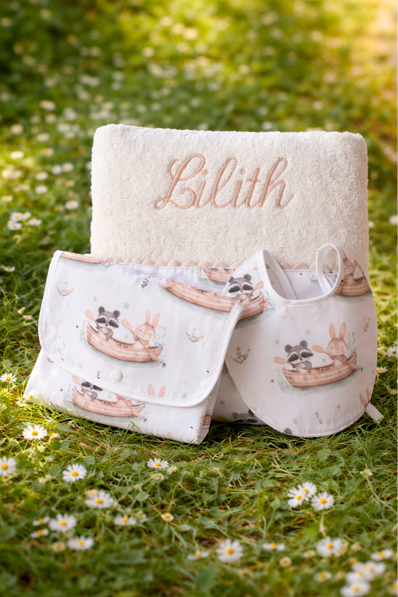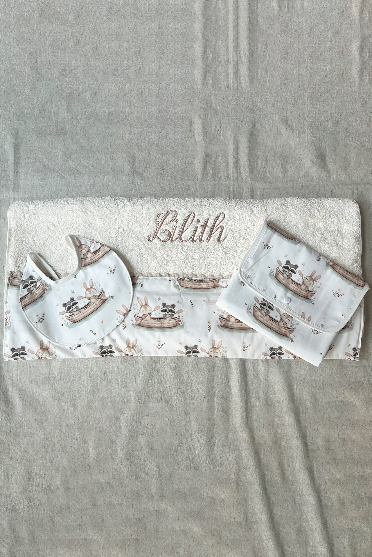 Set bebé personalizado 3 piezas – Toalla, cambiador y babero