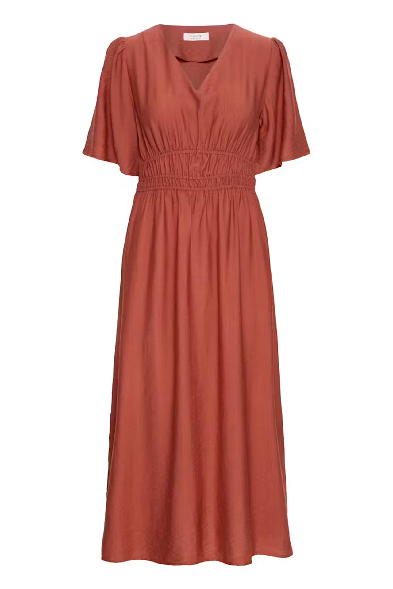 Vestido corto b.young confeccionado en lino y viscosa. Un diseño de tirantes finos en color tierra que destaca por su frescura, ligereza y estilo minimalista.