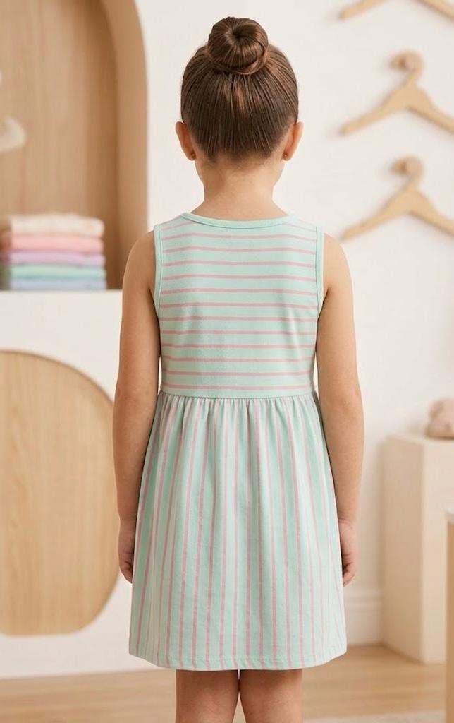Vestido infantil para niña Waterlemon 591-40 con diseño de rayas en verde agua y rosa. Confeccionado en 96% algodón y 4% elastano, es suave, cómodo y perfecto para el día a día en primavera y verano.